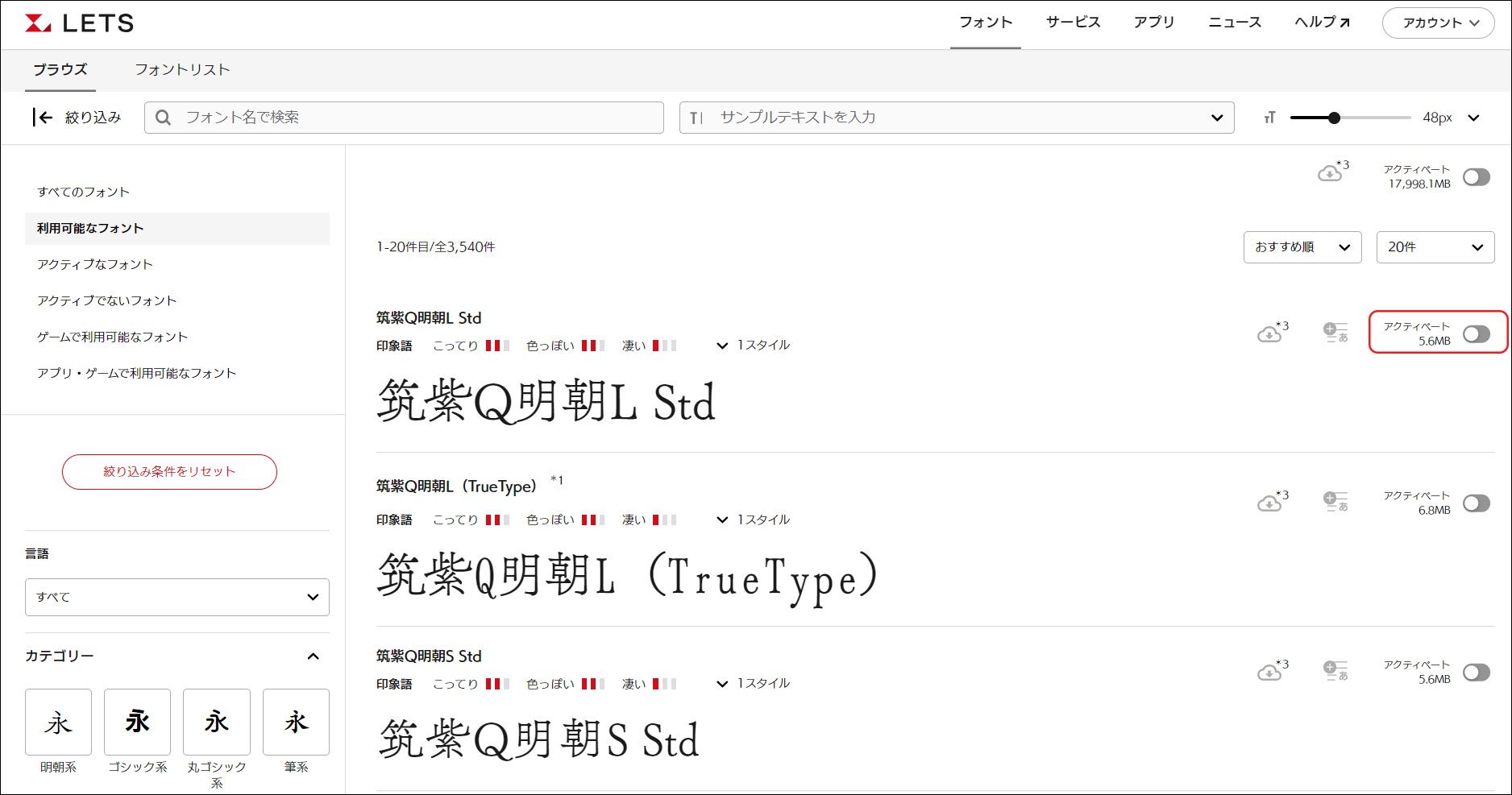 Webサイトのフォント > ブラウズで一覧に表示されるフォントのアクティベートボタンを押すと、ウェイトを含めたフォントがすべてインストールされます。