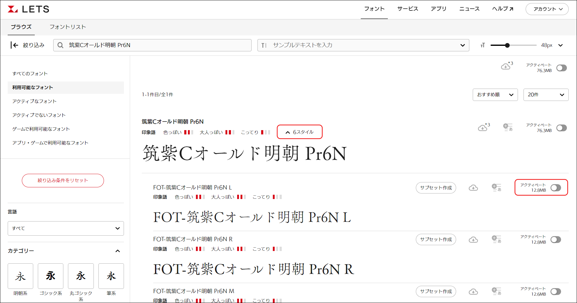 複数のウェイトがあるフォント毎で個別にインストールする場合は、「[数字]スタイル」を押し、必要なウェイトのフォントをアクティベートします。