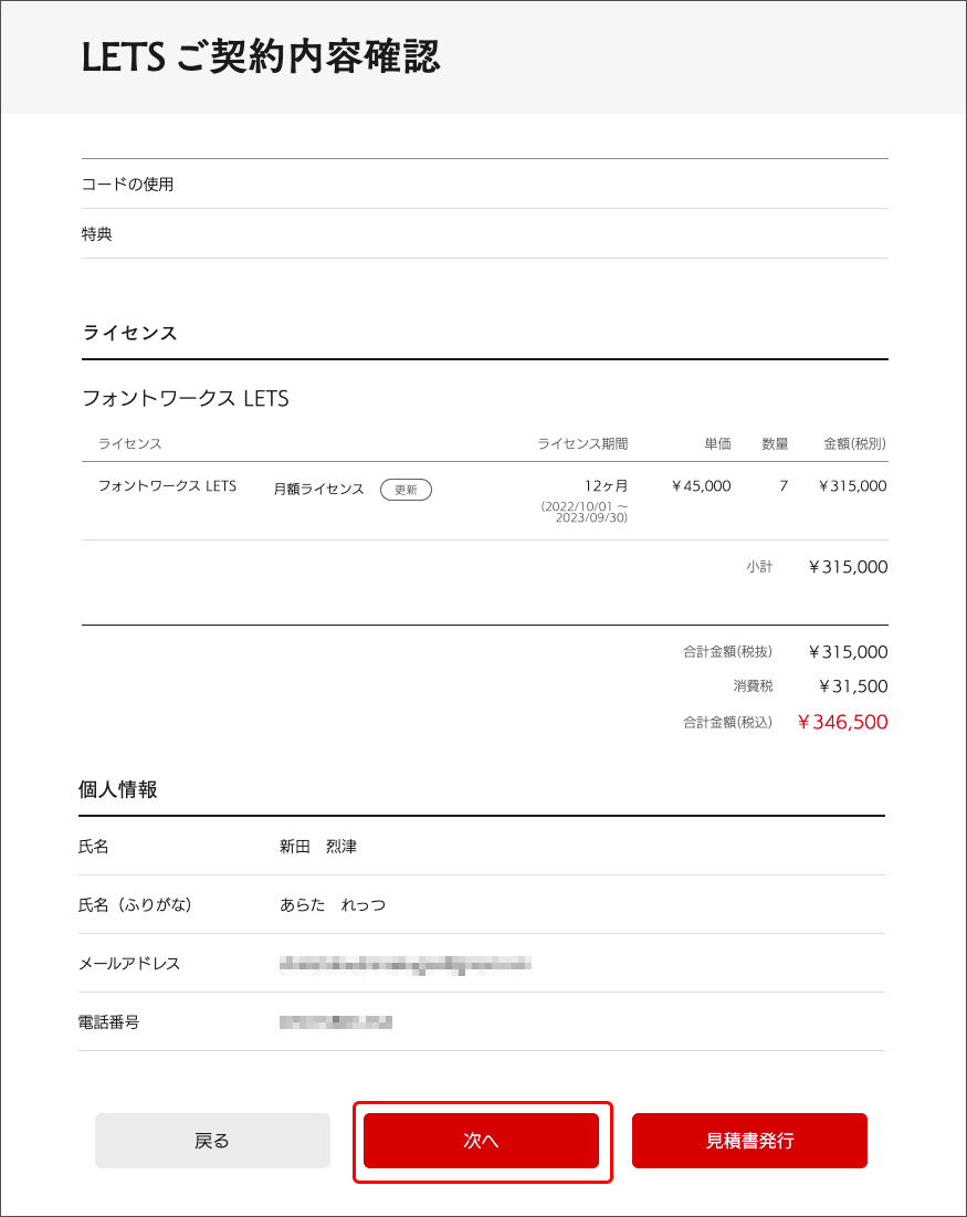 9. 「LETSご契約内容確認」の内容に相違なければ「次へ」を押してください。