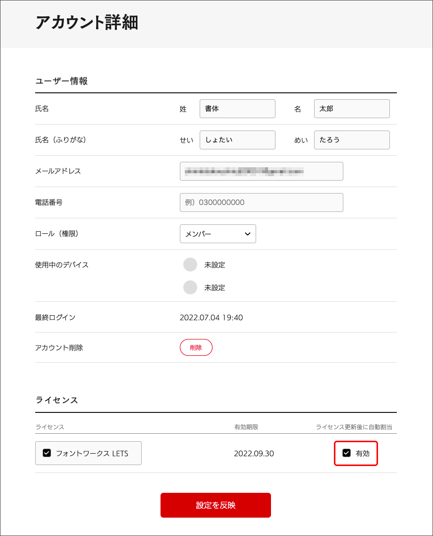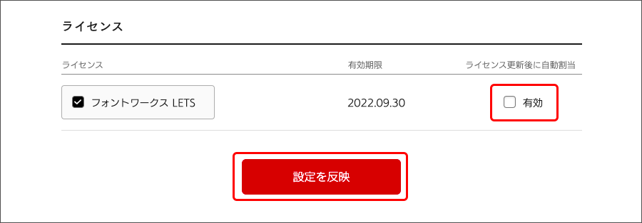5. 「アカウント詳細」のライセンス項目にある「ライセンス更新後に自動割当」の「有効」のチェックを外して、「設定を反映」を押してください。