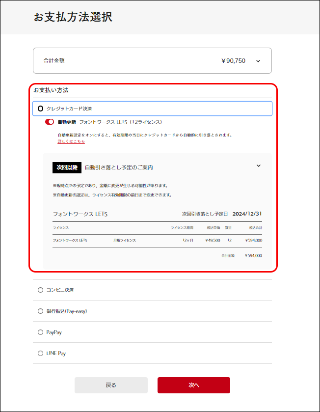 ※LETSライセンスを追加される方は「LETSライセンスを追加する」の手順をお進みの上、「お支払方法選択」へお進みください。