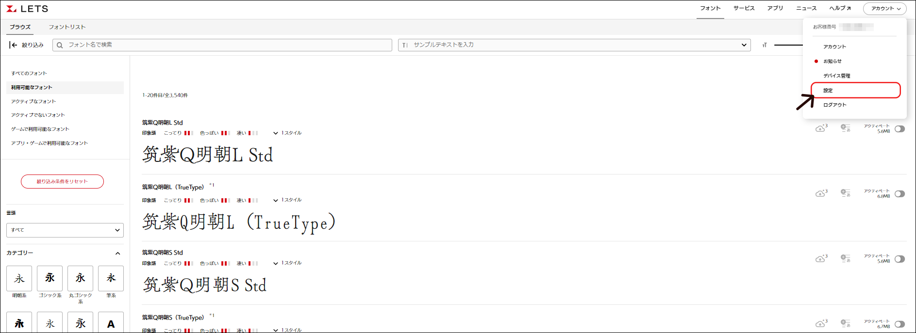 1.画面右上の「アカウント」ボタンを押下し、表示されるメニュー内の「設定」を押してください。
