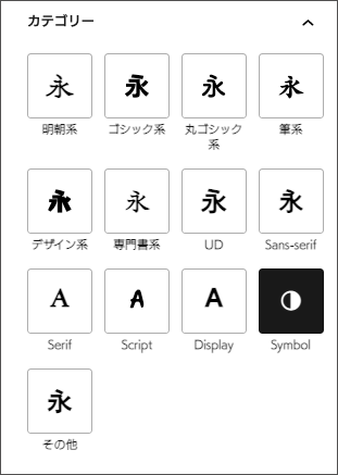 ※「San-serif」、「Serif」、「Script」、「Display」、「Symbol」はMonotype LETSのみで利用可能です。