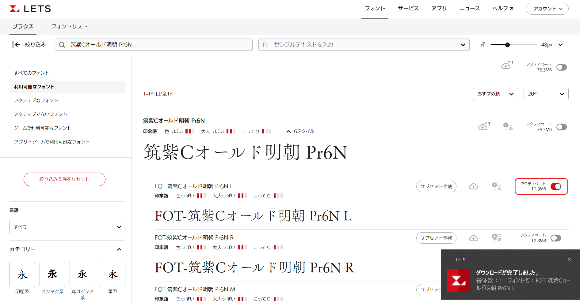 複数のウェイトがあるフォント毎で個別にインストールする場合は、「[数字]スタイル」を押し、必要なウェイトのフォントをアクティベートします。