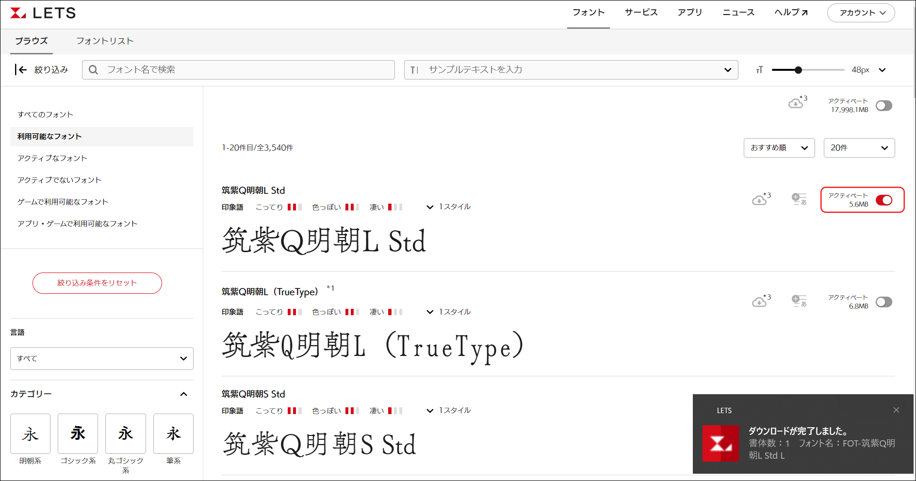 Webサイトのフォント > ブラウズで一覧に表示されるフォントのアクティベートボタンを押すと、ウェイトを含めたフォントがすべてインストールされます。