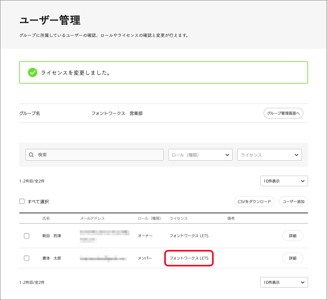 法人でご契約いただいた場合、「オーナー」は利用者にライセンスの付与(変更)を行っていただく必要がございます。