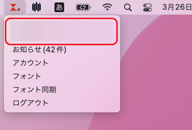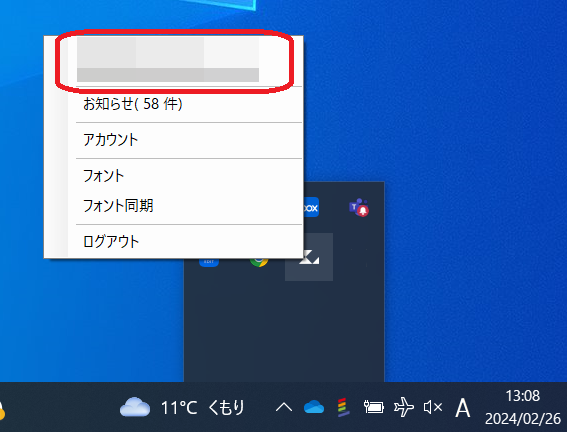 デスクトップアプリがログイン中の状態であれば、メニューの「お知らせ」上部に氏名・メールアドレスが表記されます。
