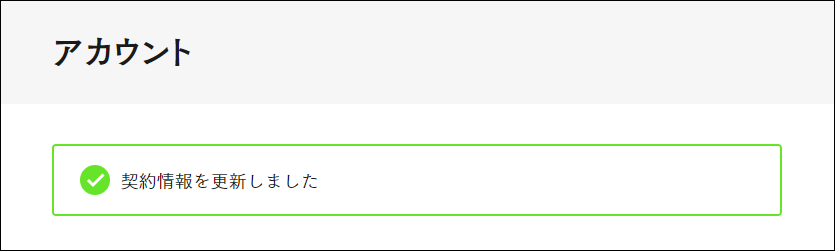 6.「アカウント」画面にメッセージ「契約情報を更新しました」が表示され、「お支払情報」欄のクレジットカード情報が更新されます。