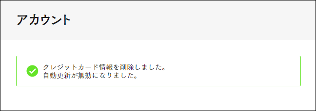 4.「アカウント」画面にメッセージ「クレジットカード情報を削除しました。自動更新が無効になりました」が表示され、「お支払情報」欄のクレジットカード情報が削除されます。