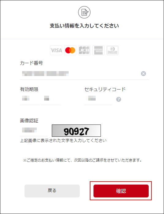 3.「カード情報を入力してください」画面で変更したいクレジットカードの『カード番号』『有効期限』『セキュリティコード』情報の入力と画像認証を対応した後に「確認」ボタンを押してください。