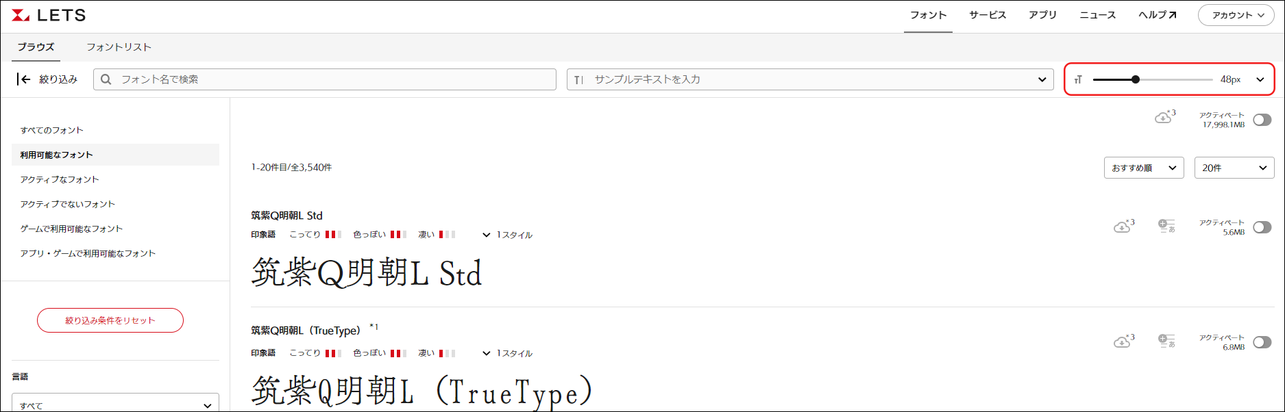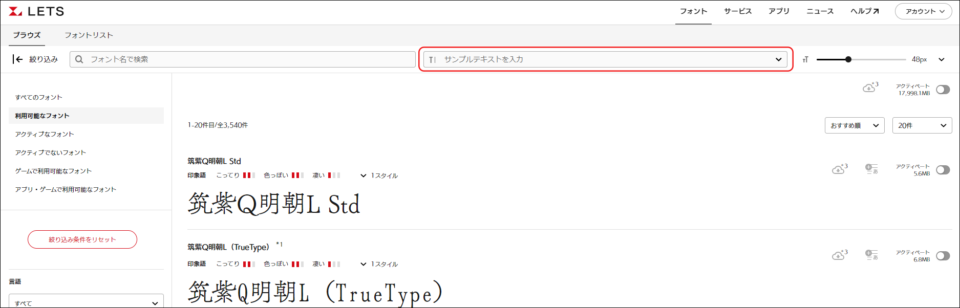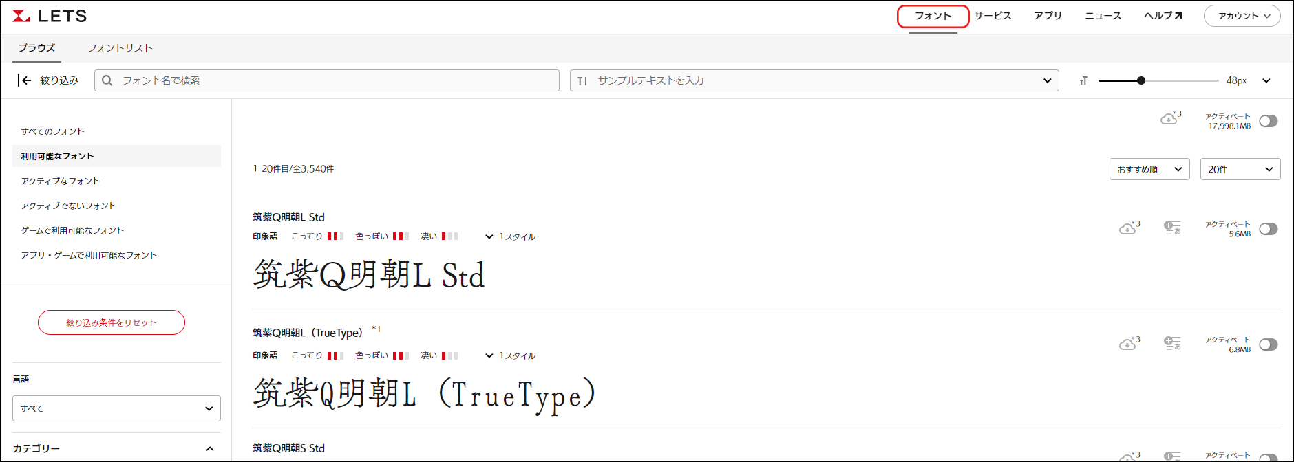 フォントページでは主にフォントの検索・サンプルイメージの確認、アクティベート/ディアクティベートが可能です。