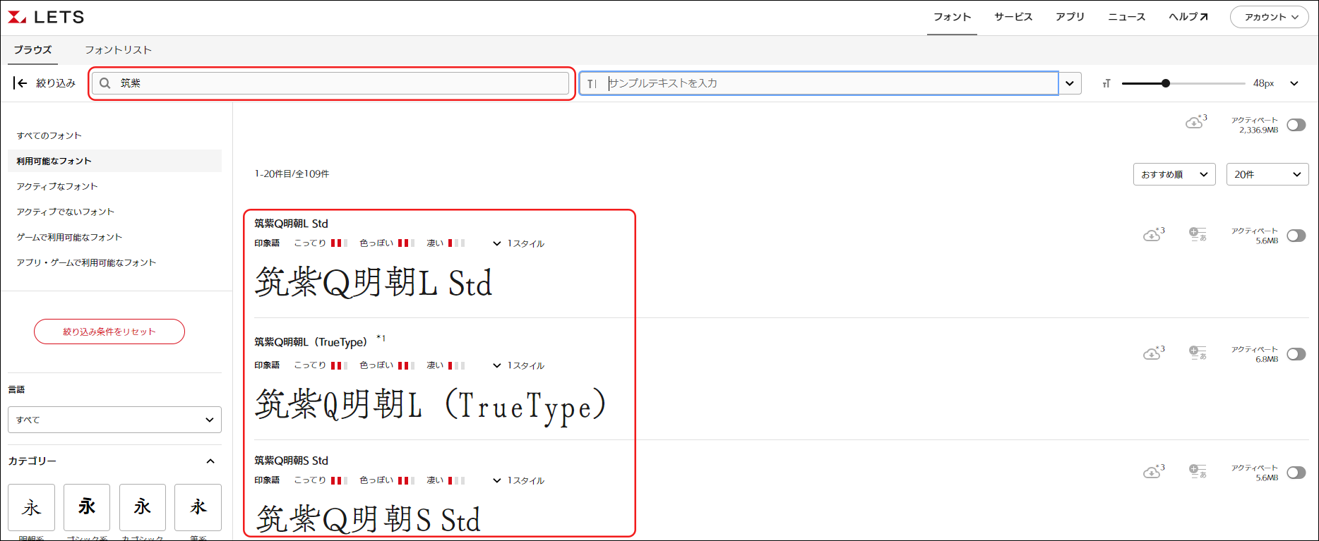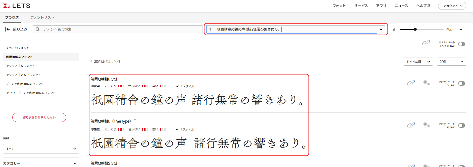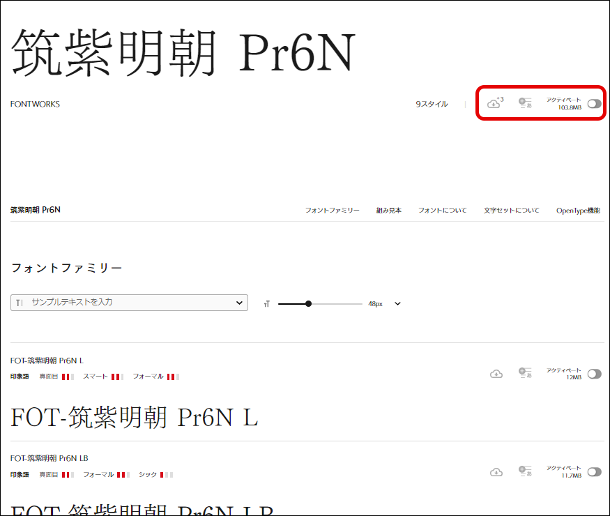 フォントページでは主にフォントの検索・サンプルイメージの確認、アクティベート/ディアクティベートが可能です。