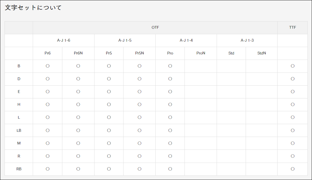 | L/M/Hなど | ウエイトの種類。ウエイトは書体の太さを表す。 |
