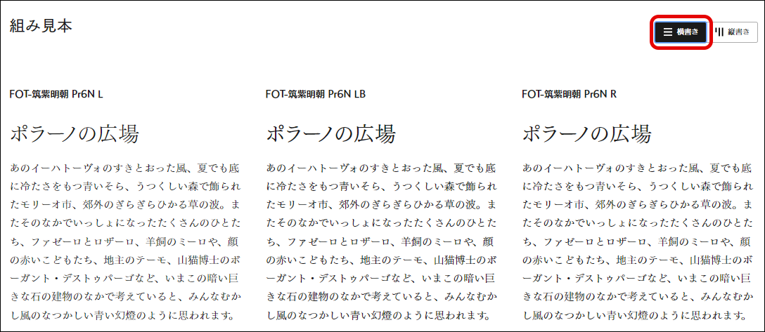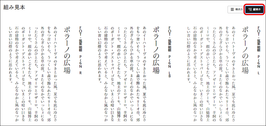 赤枠のボタンを切り替えることで、横書きと縦書きの組み見本を確認できます。