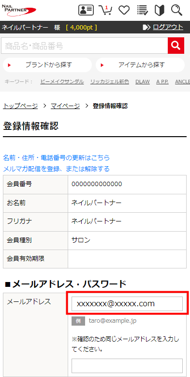 このページではメールアドレスの変更もできのでメールアドレスが変更になった場合はご変更をお願いします。