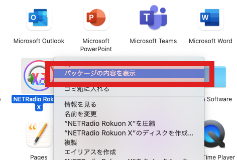 1. アプリケーション フォルダ から NETRadio Rokuon Xを右クリック(control + クリック)し、パッケージの内容を表示を選択し開く