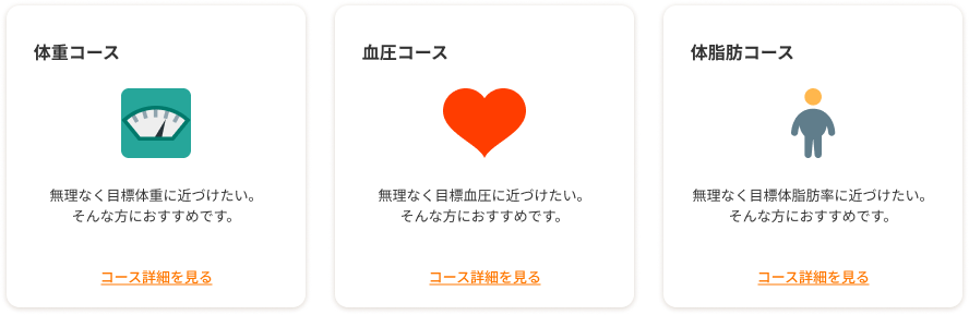 コースとは何なのか、どんなコースがあるのか知りたい コースとは、あなたが改善したい健康目標の具体的な指標です。現在、体重コース、血圧コース、体脂肪コースの3種のうち、いずれかを選択できます。このほか、有料版のスプレマシープランでは、記憶力や筋肉など、任意の指標を設定できます。