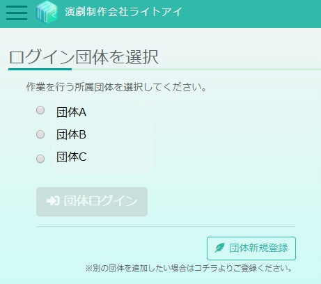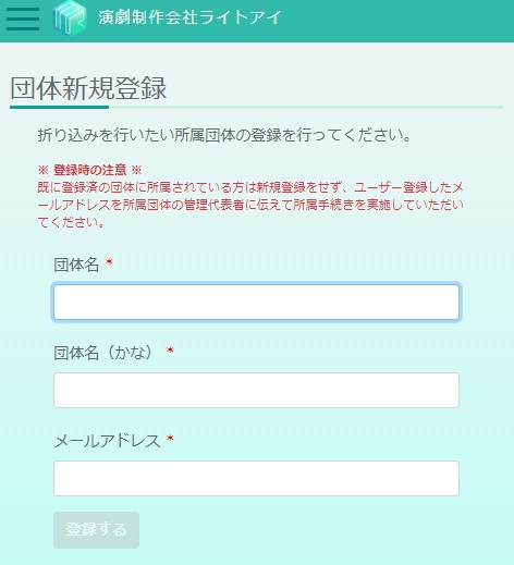 「団体新規登録」より新しい団体情報を入力して作成してください