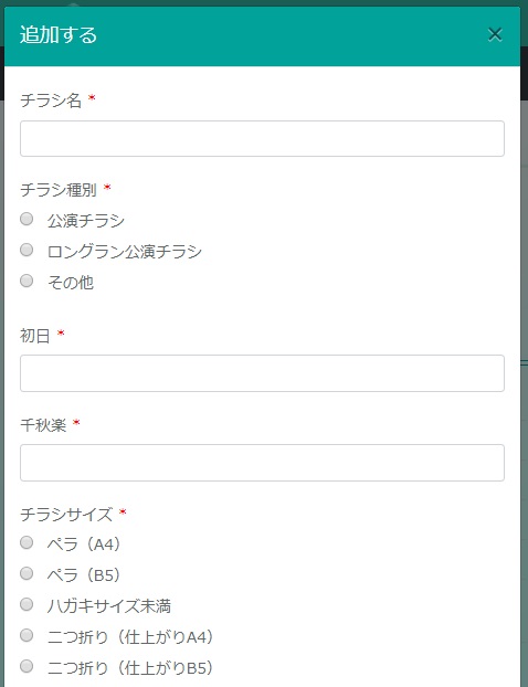 自団体のチラシ名、種別、日程やサイズ等を入力していきます。