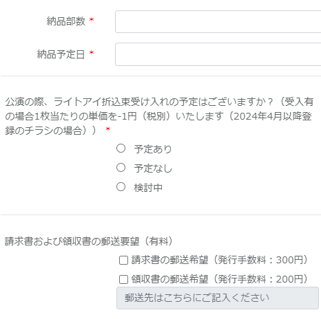 引き続き、チラシの納品方法や納品部数・納品予定日等を入力していきます。