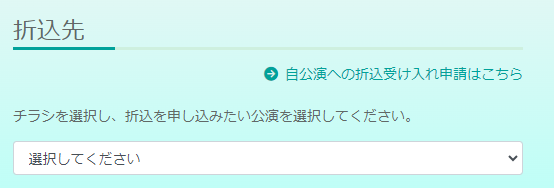 右上の「自公演への折込受け入れ申請はこちら」をクリックし、折込チラシ束を受け入れる公演の内容を入力し「申請する」ボタンを押します。