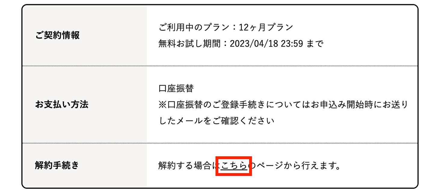 「解約手続き」の項目の「こちら」のリンクから解約ページへアクセスできます。