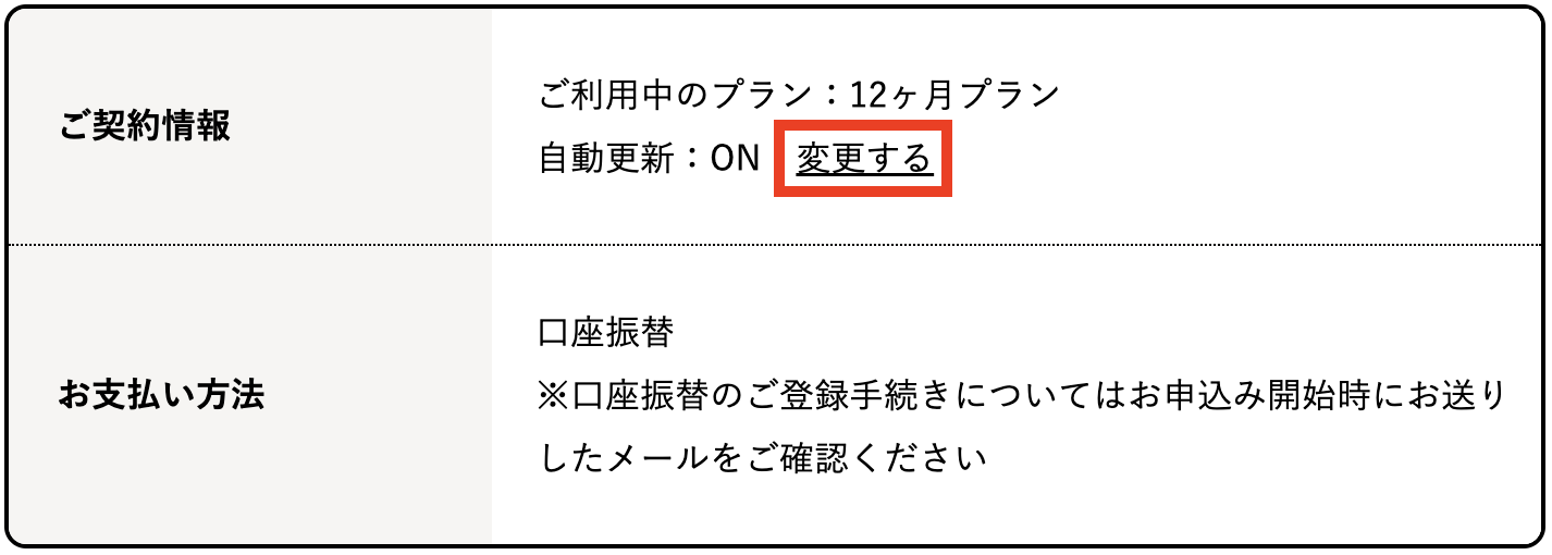 「ご契約情報」の項目の「変更する」のリンクから自動更新設定変更ページへアクセスできます。