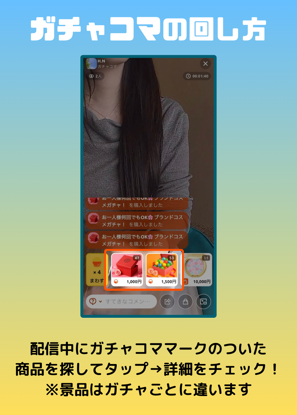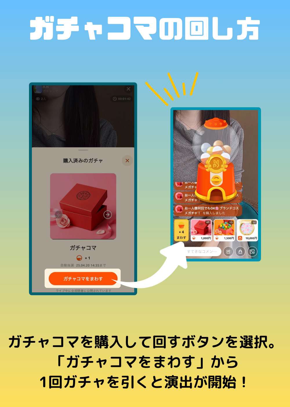 新機能「ガチャコマ」は、ライブ配信中にガチャガチャ形式でモノ商品を販売できる機能です!リスナーはガチャを購入し、配信中にガチャ演出とともに何が当たるかを楽しむことができます。