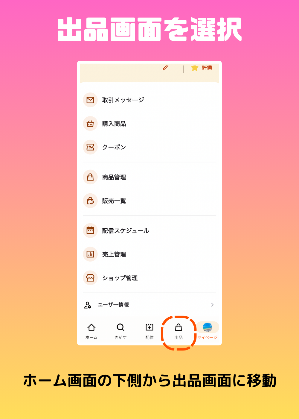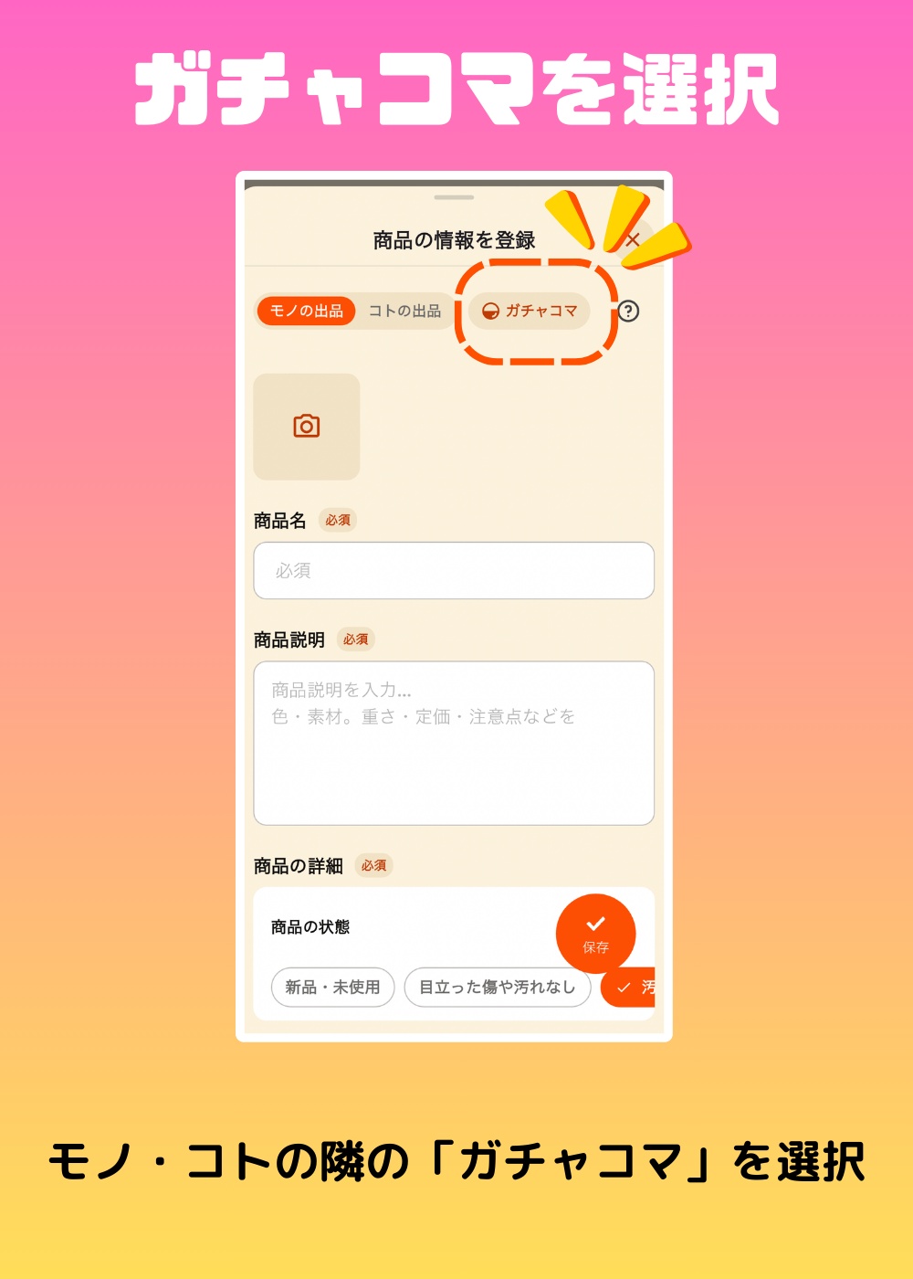 出品登録画面で「ガチャコマ作成」ボタンを選択します。