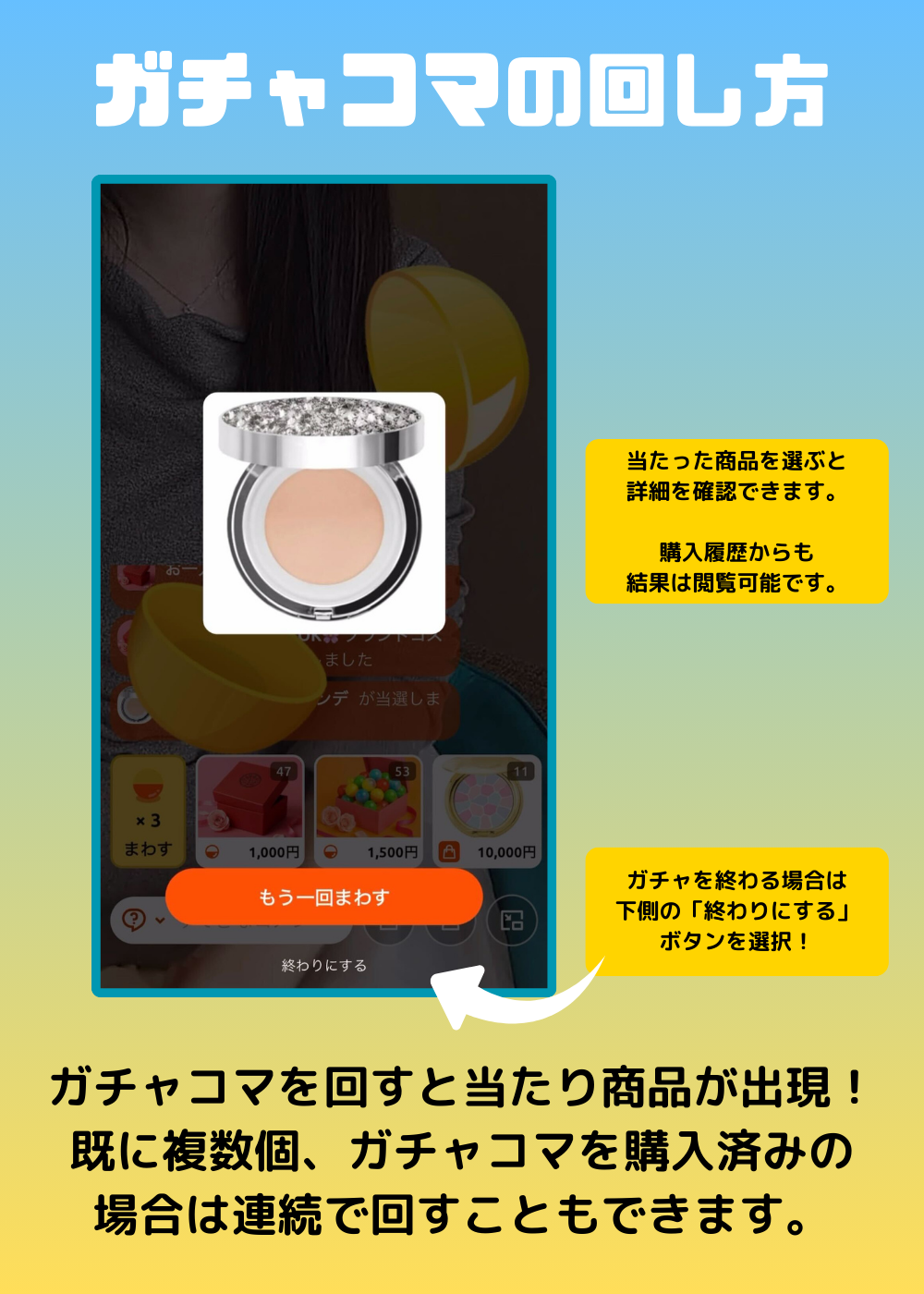 ・商品の価格は表示されませんが、ガチャ体験を含め、対価に見合った価値のある設計となっています。