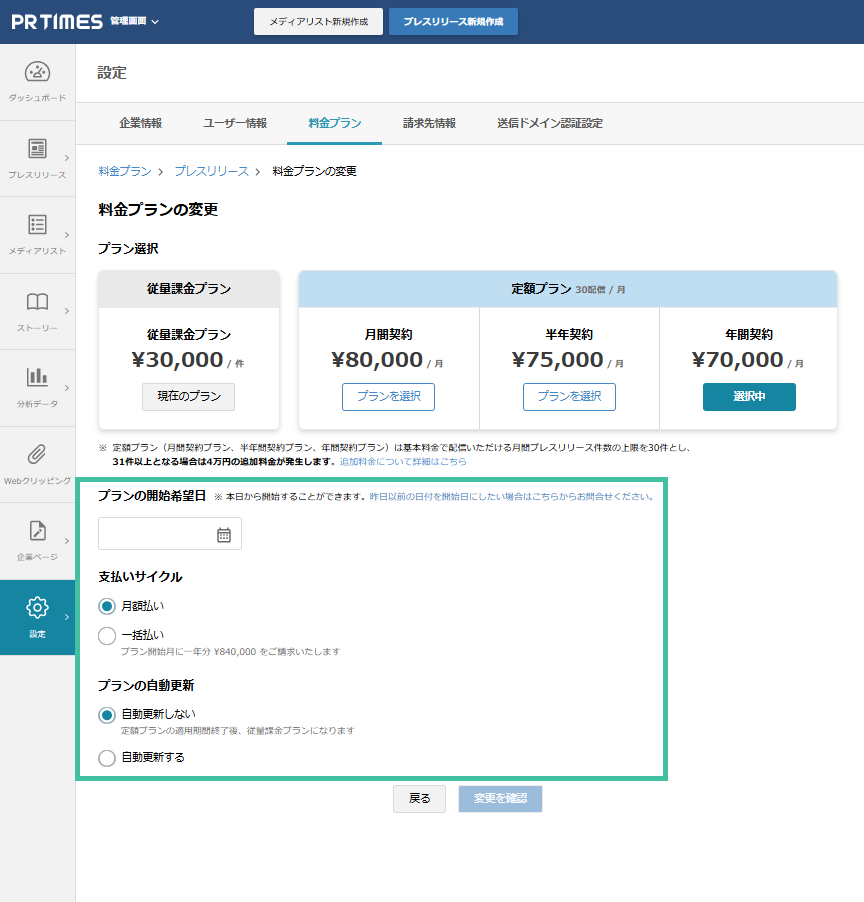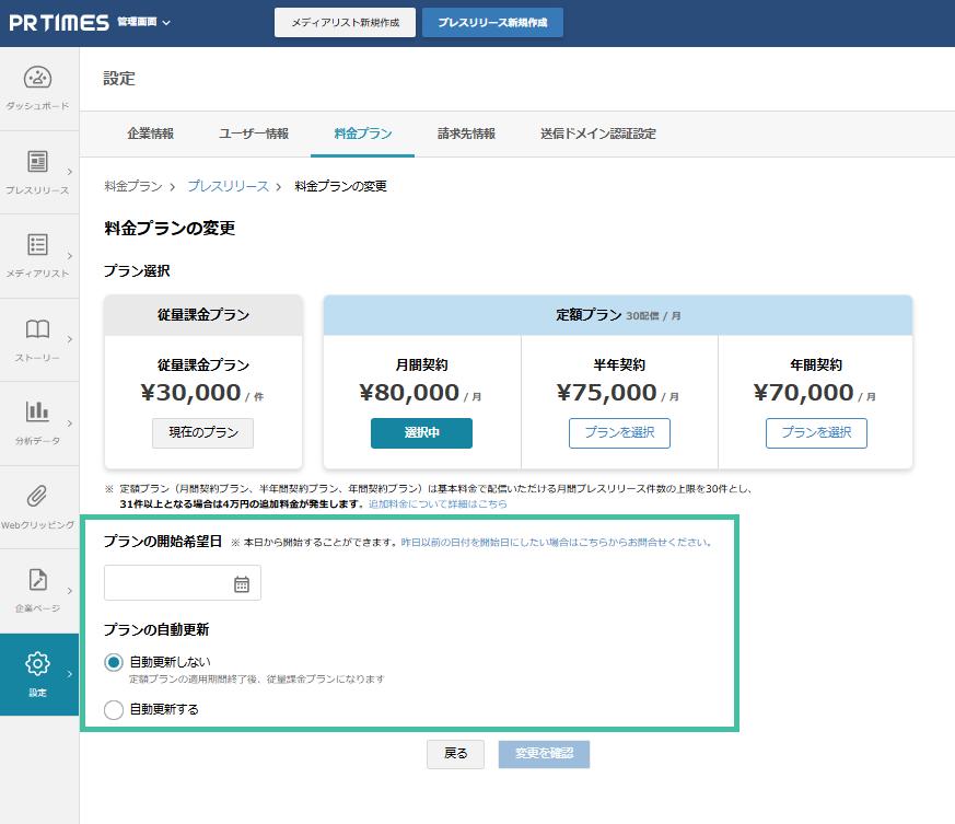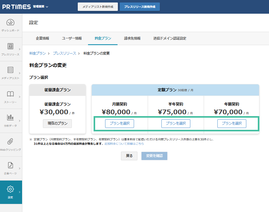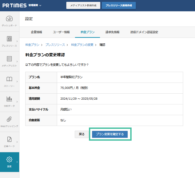 ③「変更を確認」をクリックし、内容を確認して「プラン変更を確定する」
