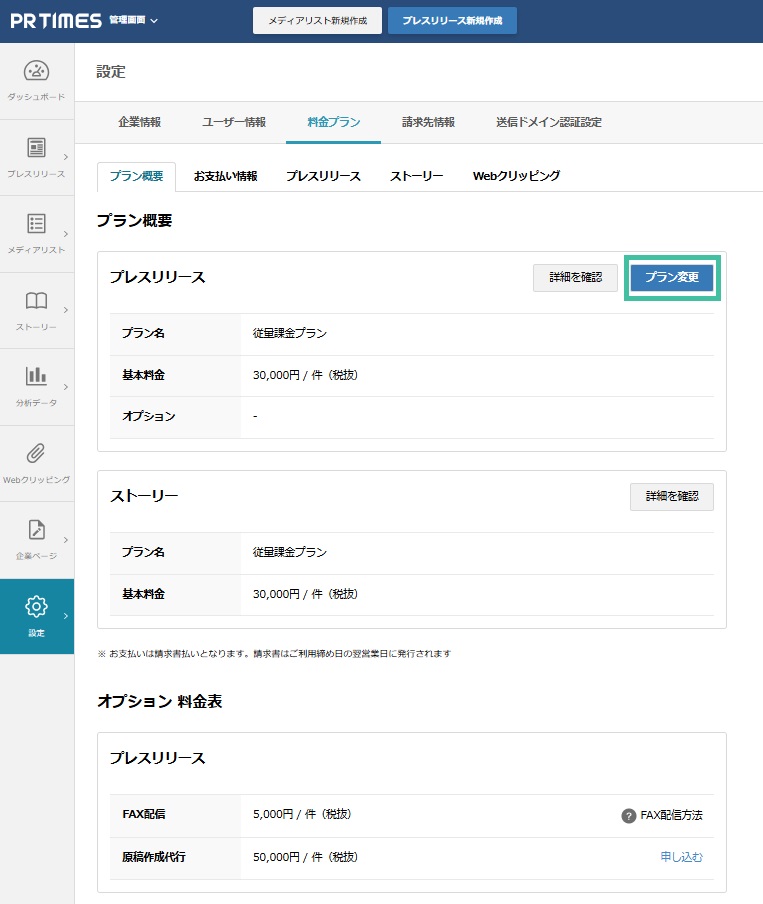 ①管理画面ログイン>>「設定」>>「料金プラン」>>「プラン概要」>>「プラン変更」