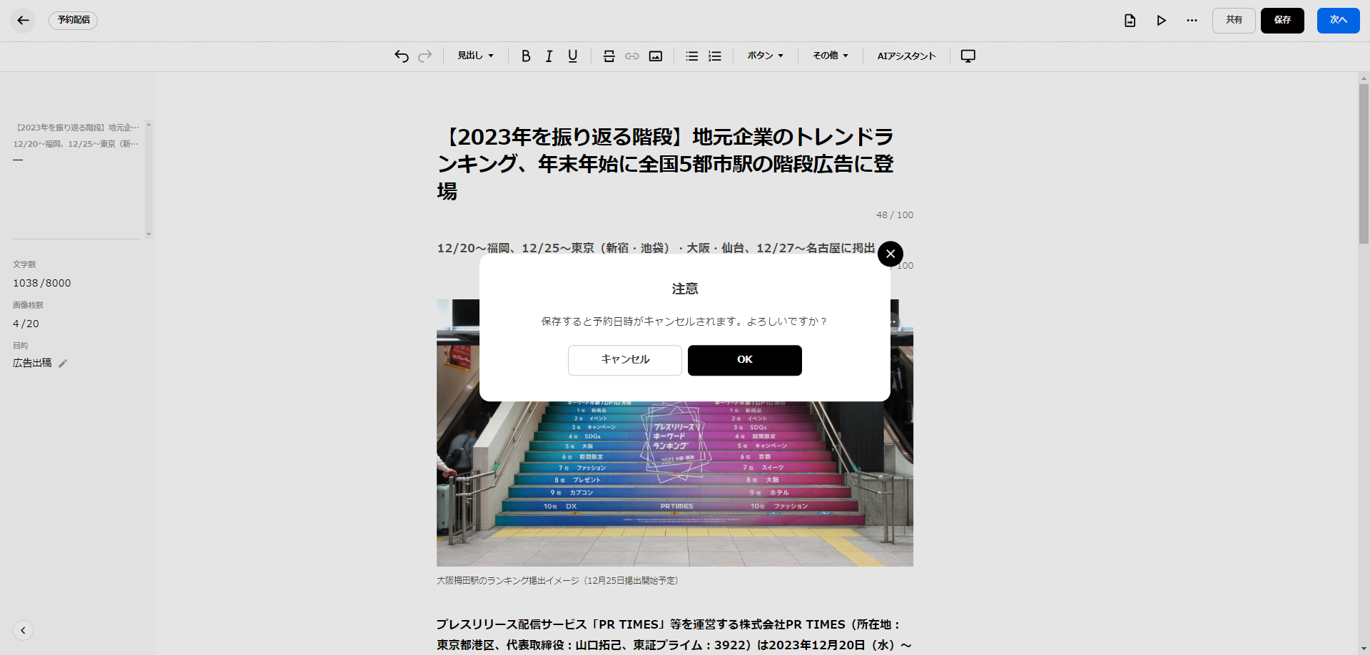 予約日時キャンセルの確認表示で「OK」を押すと、予約が解除され、下書き状態に戻ります。