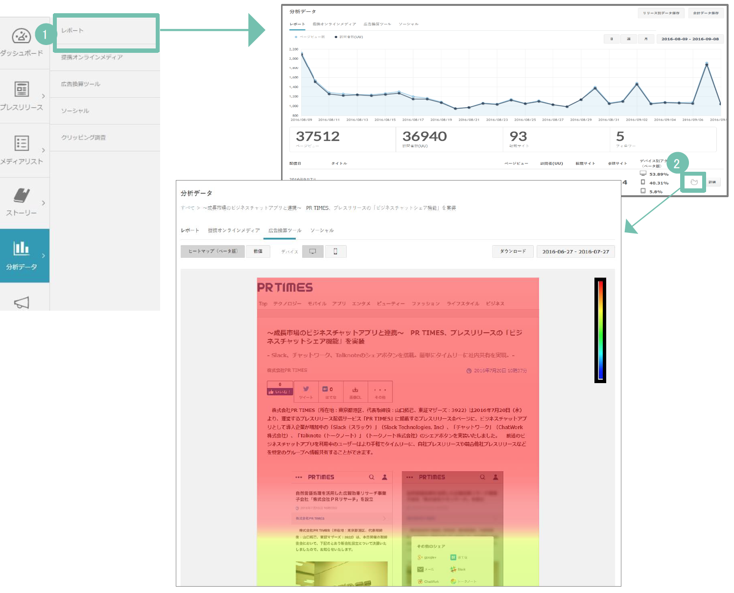 PR TIMESに掲載されているプレスリリースのうち、パソコンとスマートフォン、それぞれからアクセスされた際のページ内の閲覧状況を可視化できる方法【ヒートマップ】をご覧いただけます。