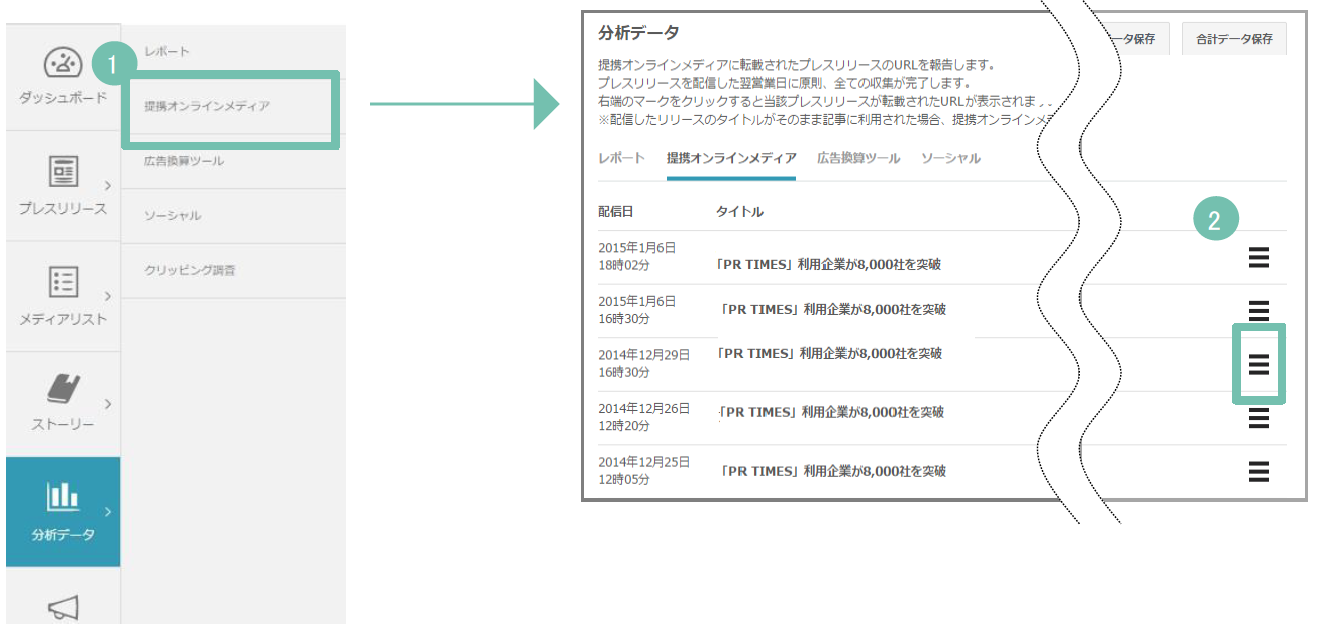 ① サイドメニュー 「分析データ」≫「提携オンラインメディア」をクリックください。
