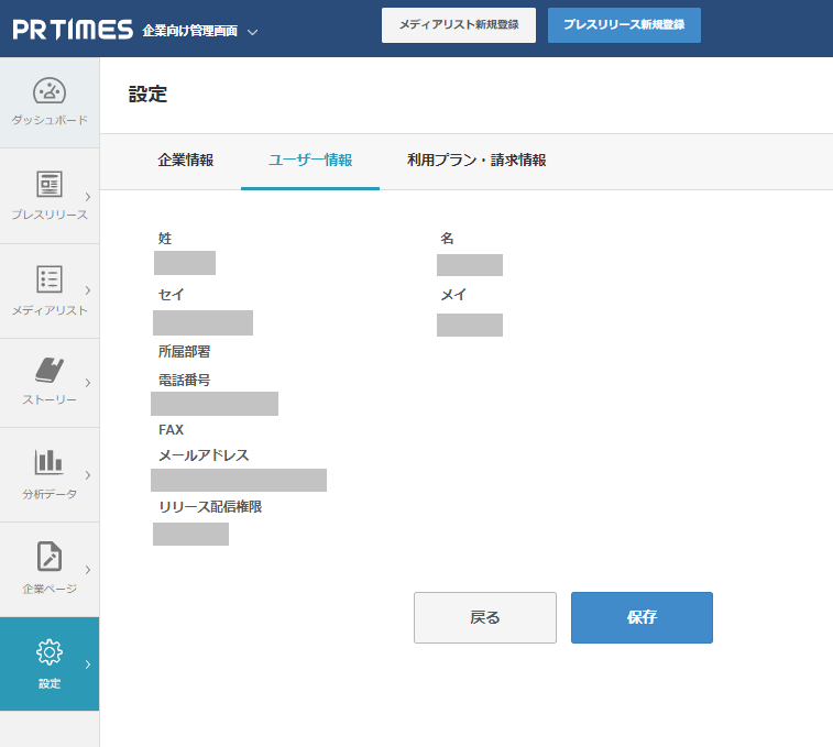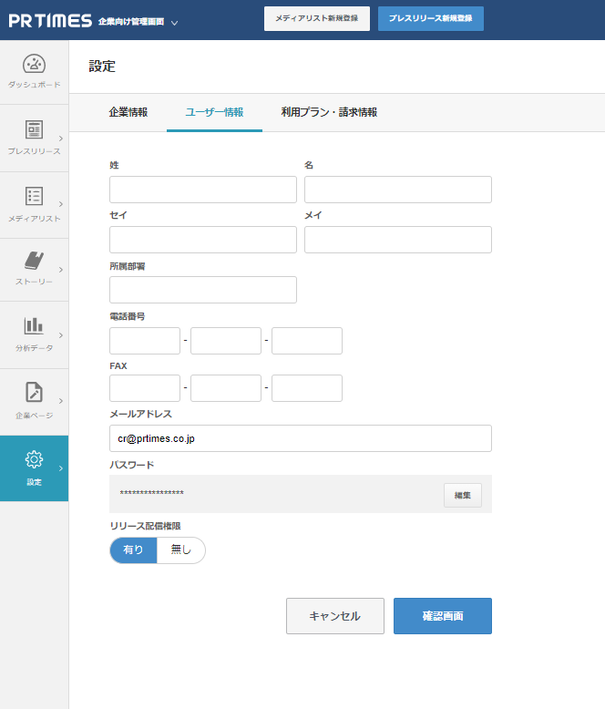 1.管理画面ログイン>>「設定」>>「ユーザー情報」>>「編集」