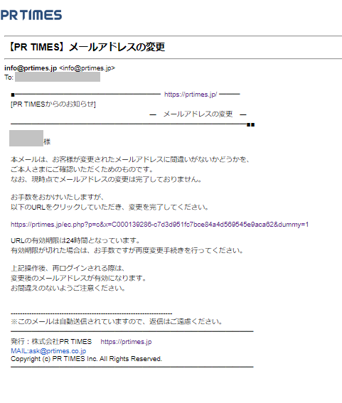 変更後のメールアドレス宛にご本人さま確認の自動メールが届きます。メール内URLをクリックすることで変更が完了します。