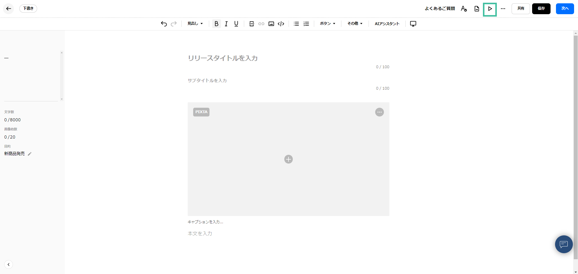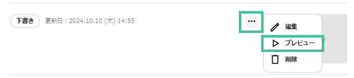 1.プレスリリース一覧の三点リーダー「・・・」や、入稿画面の右上「▷」の「プレビュー」をクリック