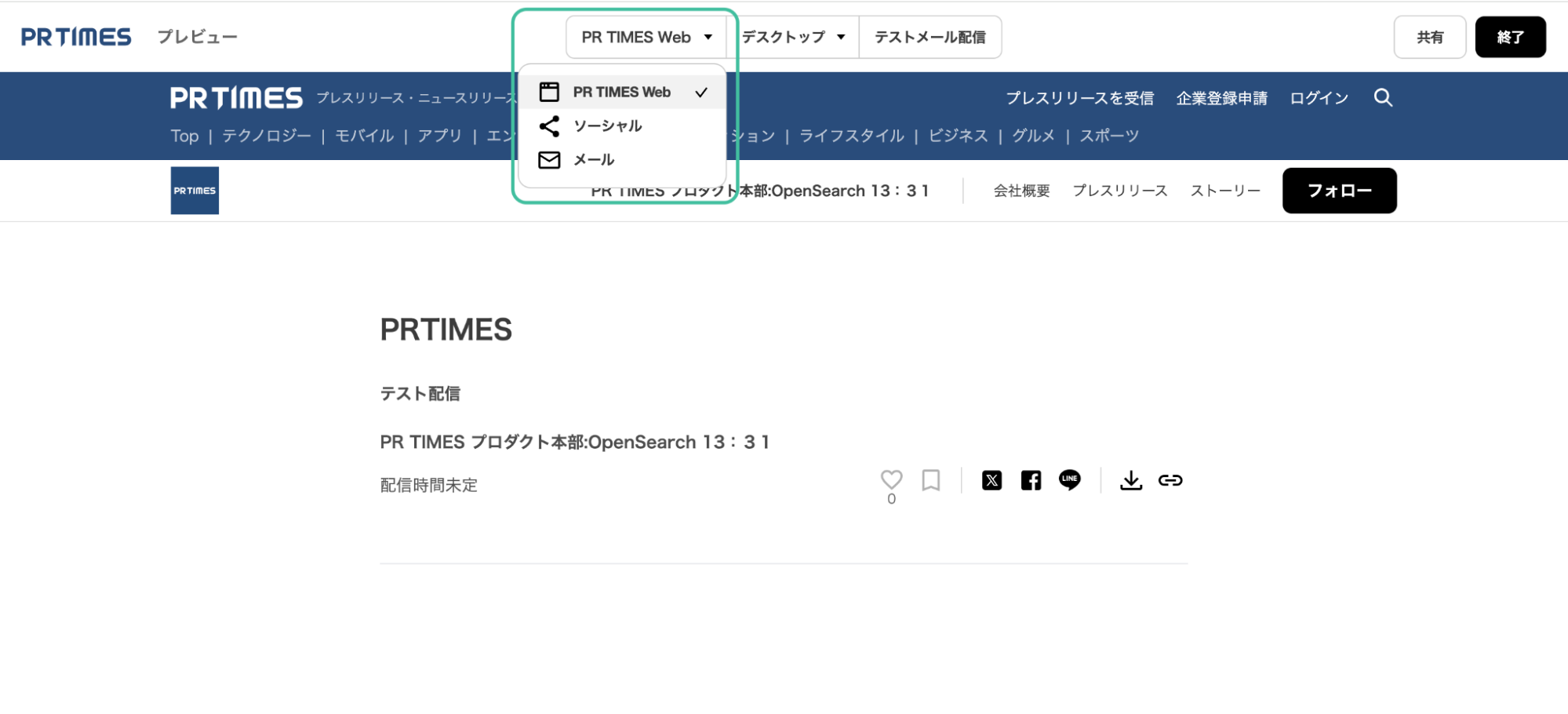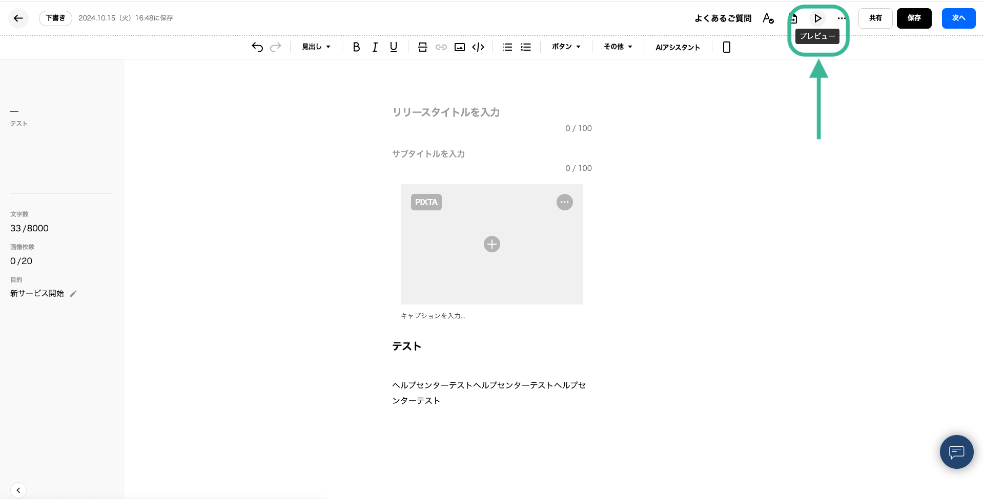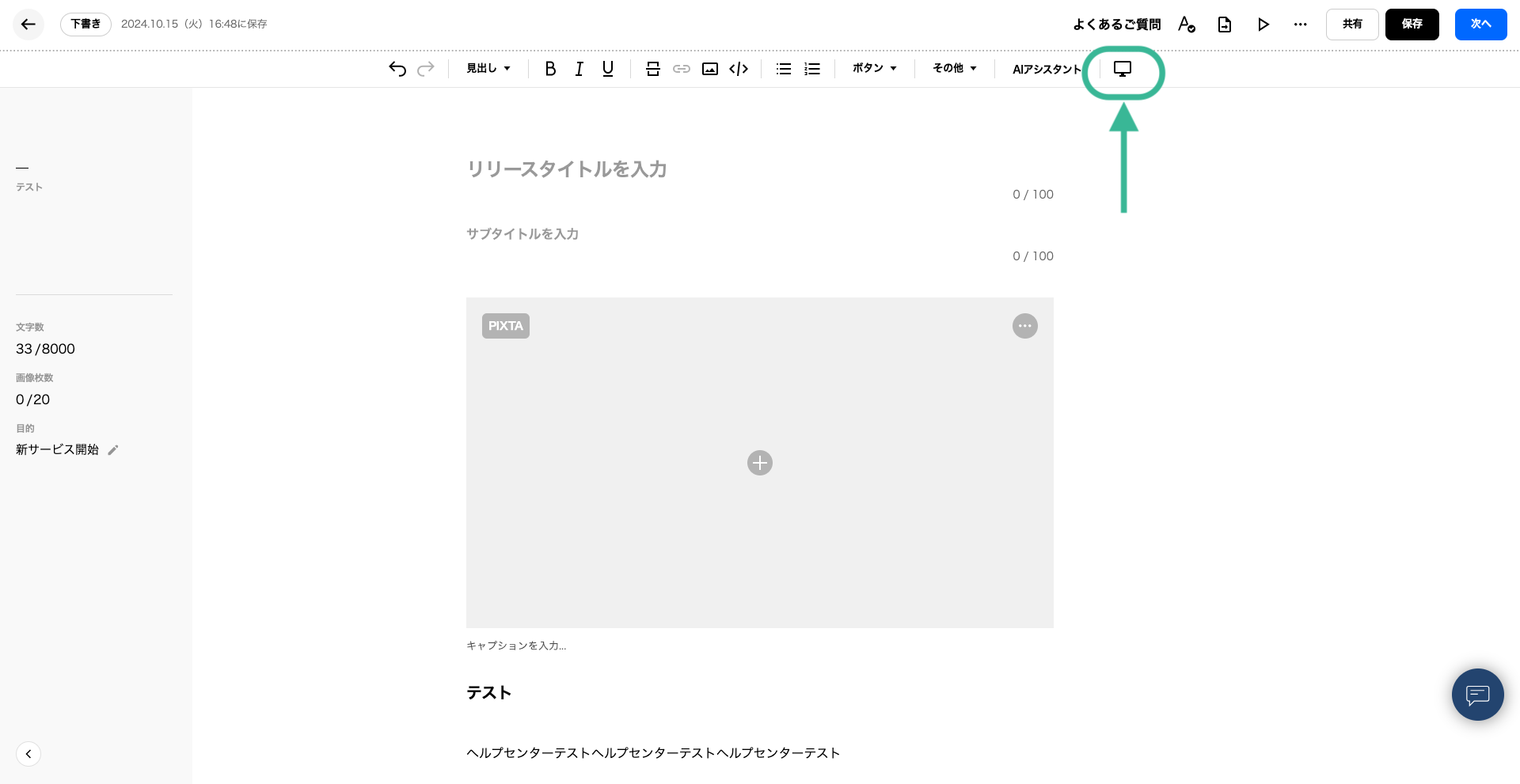 画面右上の「プレビュー」アイコンをクリックすると、配信前のプレスリリースを確認することができます。