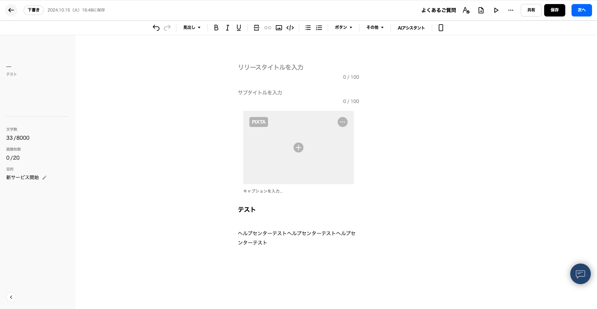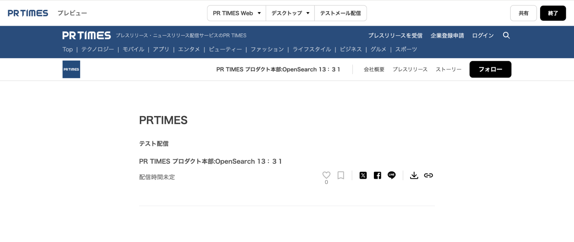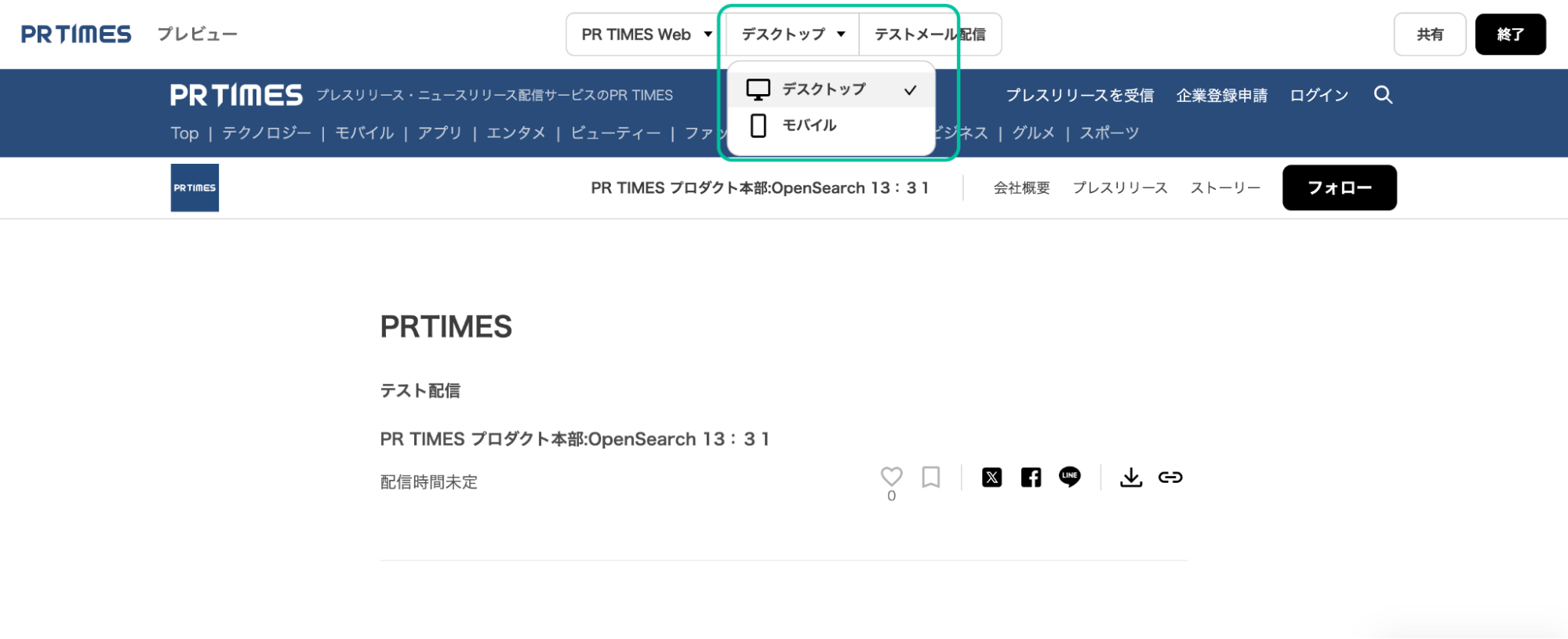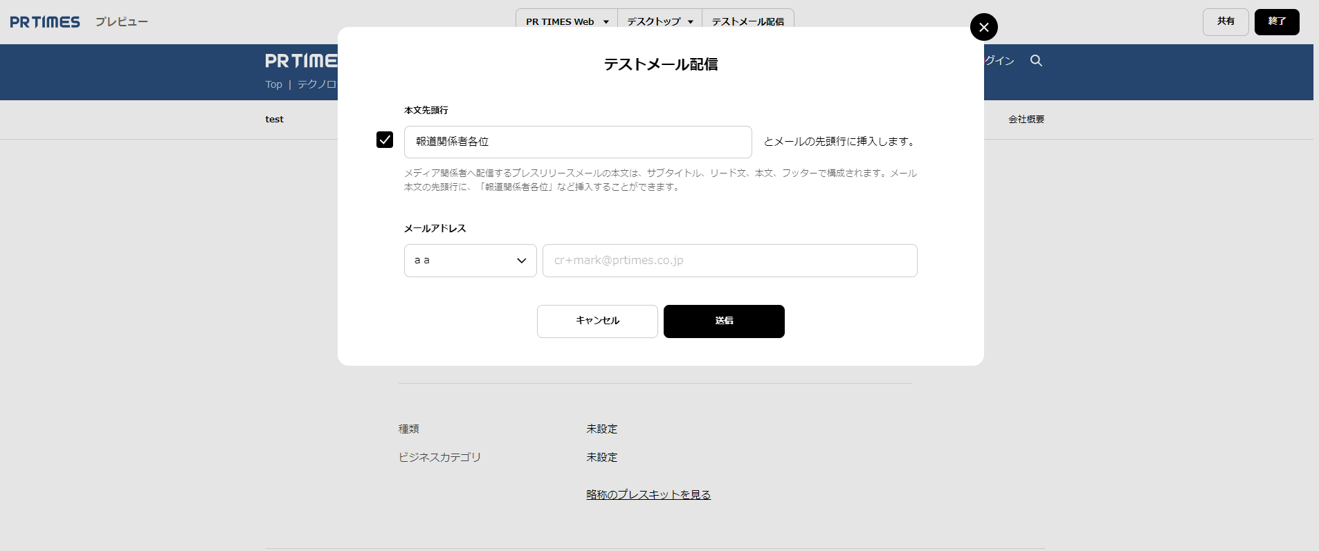 画面右上の「プレビュー」アイコンをクリックすると、配信前のプレスリリースを確認することができます。