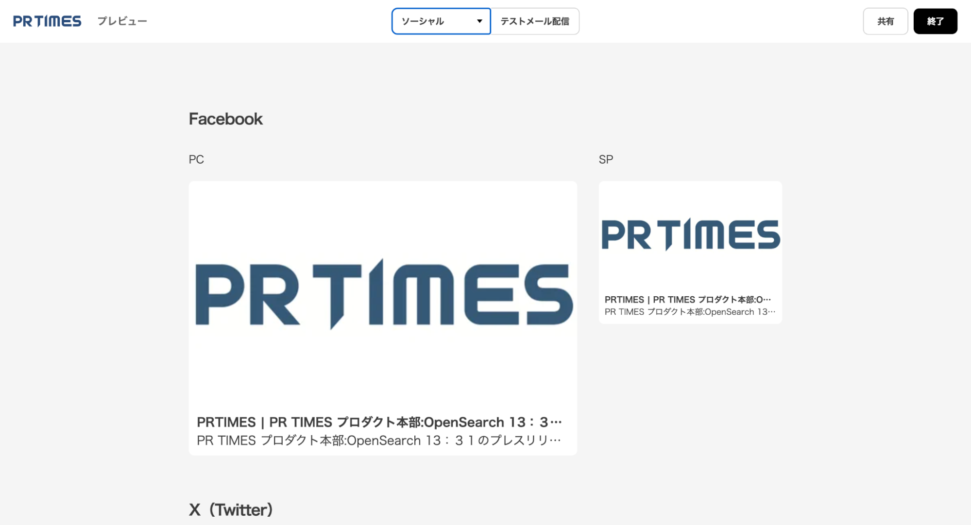 「ソーシャル」ではFaceBookと、X(旧Twitter)でシェアされる際のプレビュー画面を確認できます。