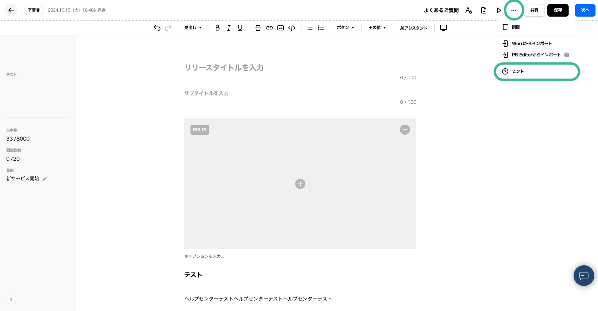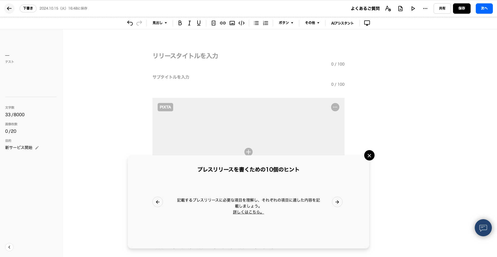 プレスリリース新規作成画面より、プレスリリースの執筆に役立つ10個のヒントをご覧いただくことができます。
