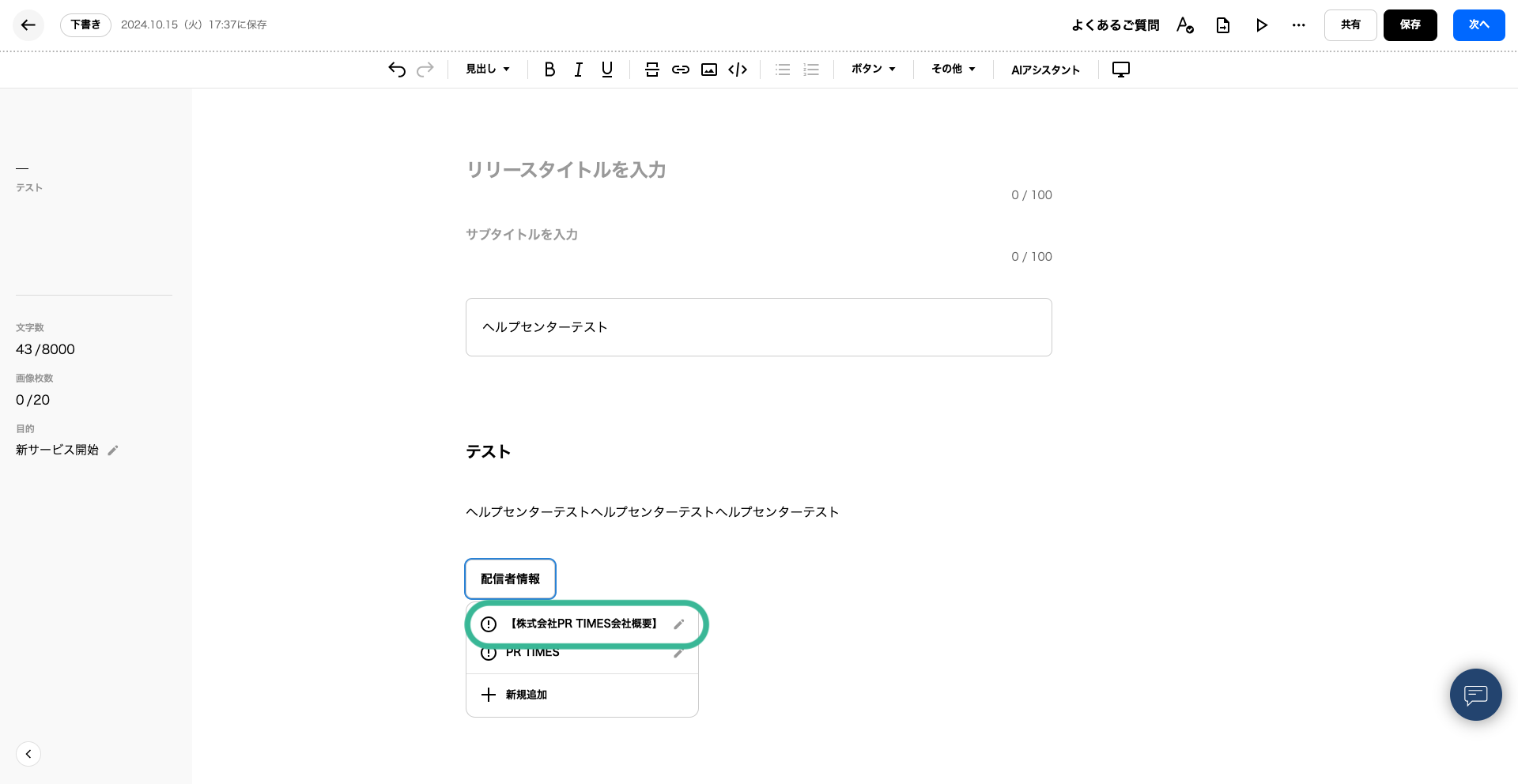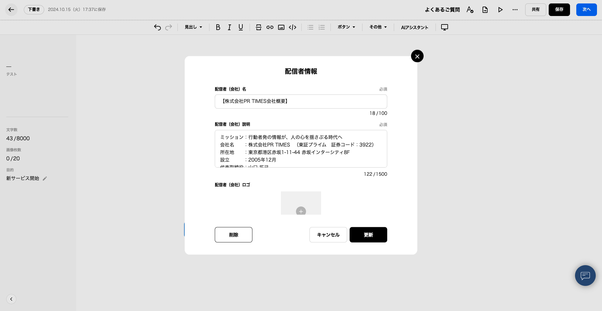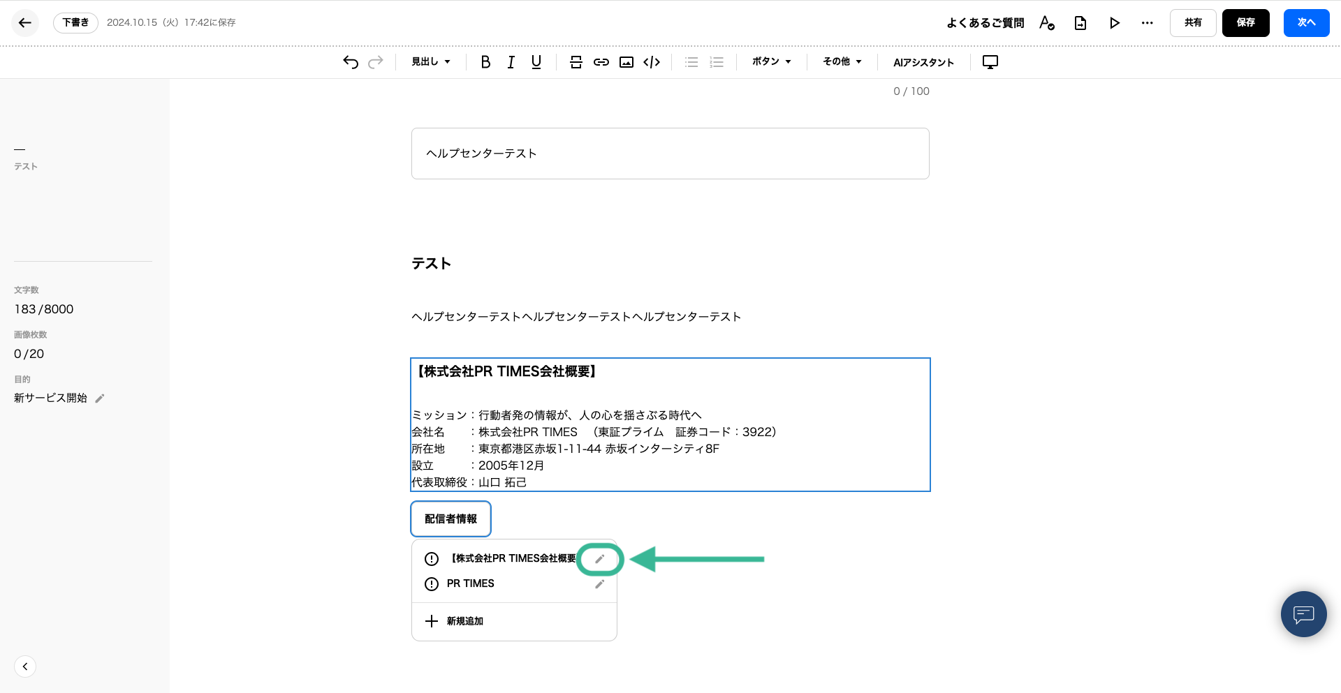 というアラートが出た場合、プレスリリース編集画面内に設定が完了していない「配信者情報」のボタンがございます。該当のボタンをバックスペース等で削除いただくようお願いいたします。