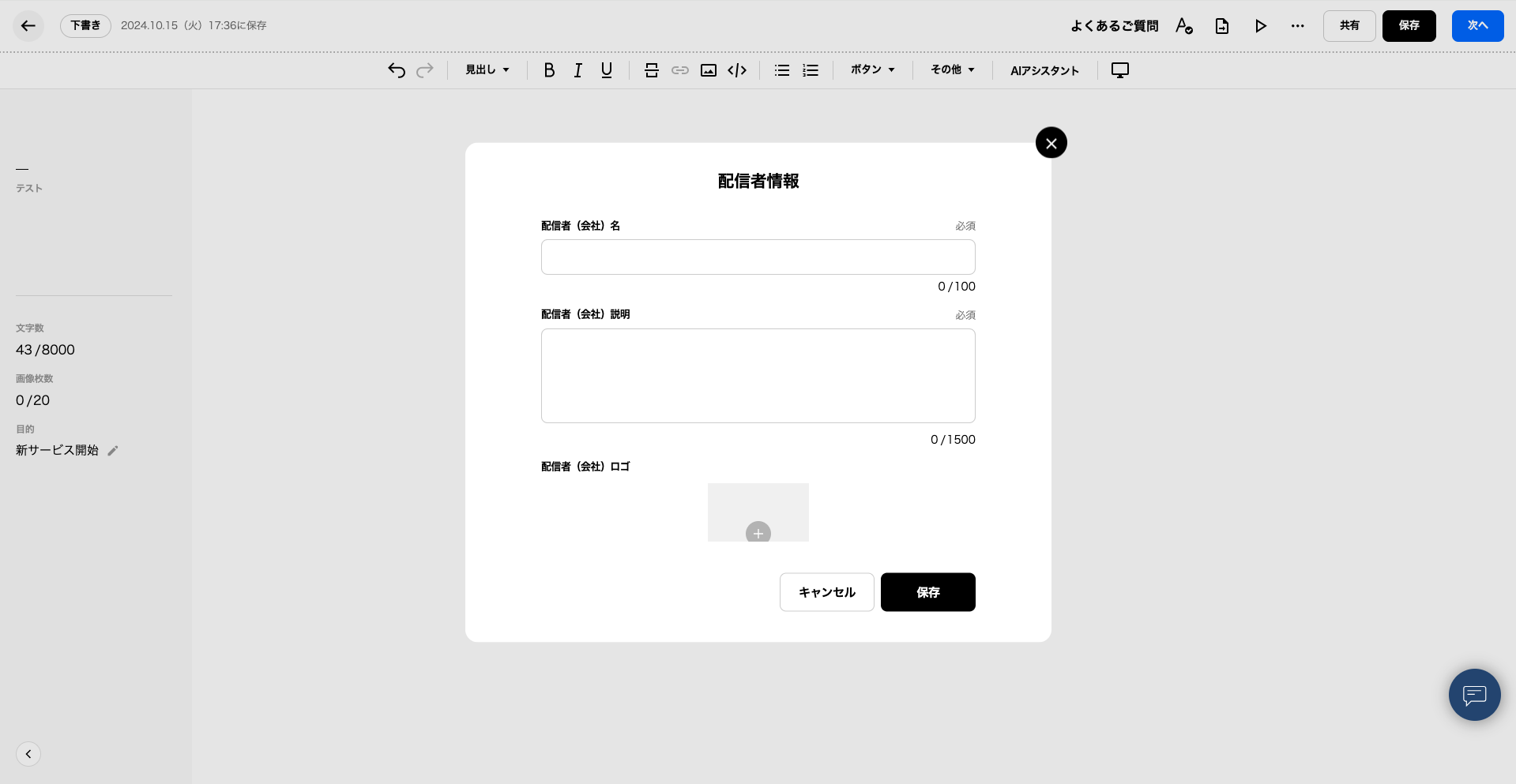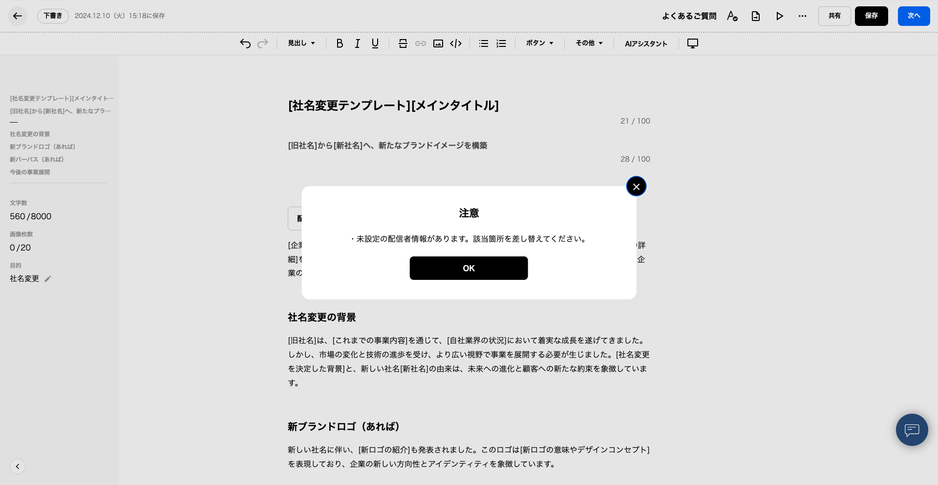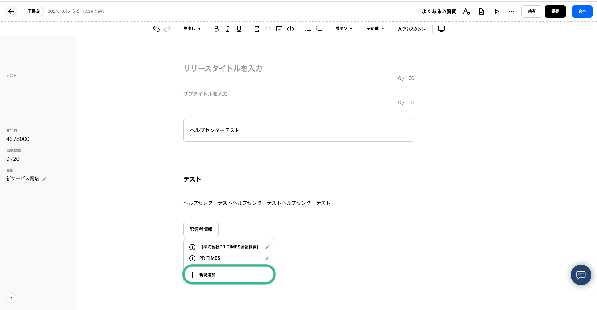 というアラートが出た場合、プレスリリース編集画面内に設定が完了していない「配信者情報」のボタンがございます。該当のボタンをバックスペース等で削除いただくようお願いいたします。