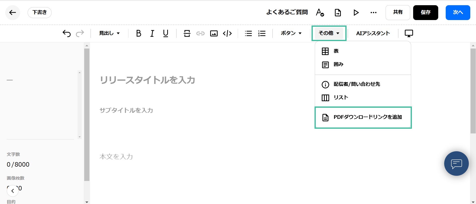 プレスリリースに、PDFファイルをダウンロードできるリンクを追加することができます。