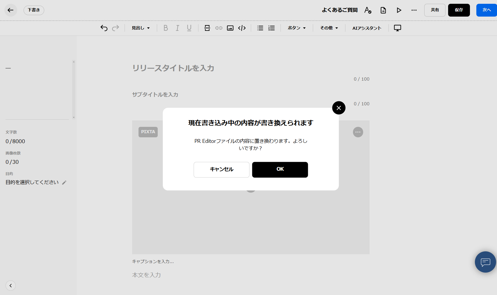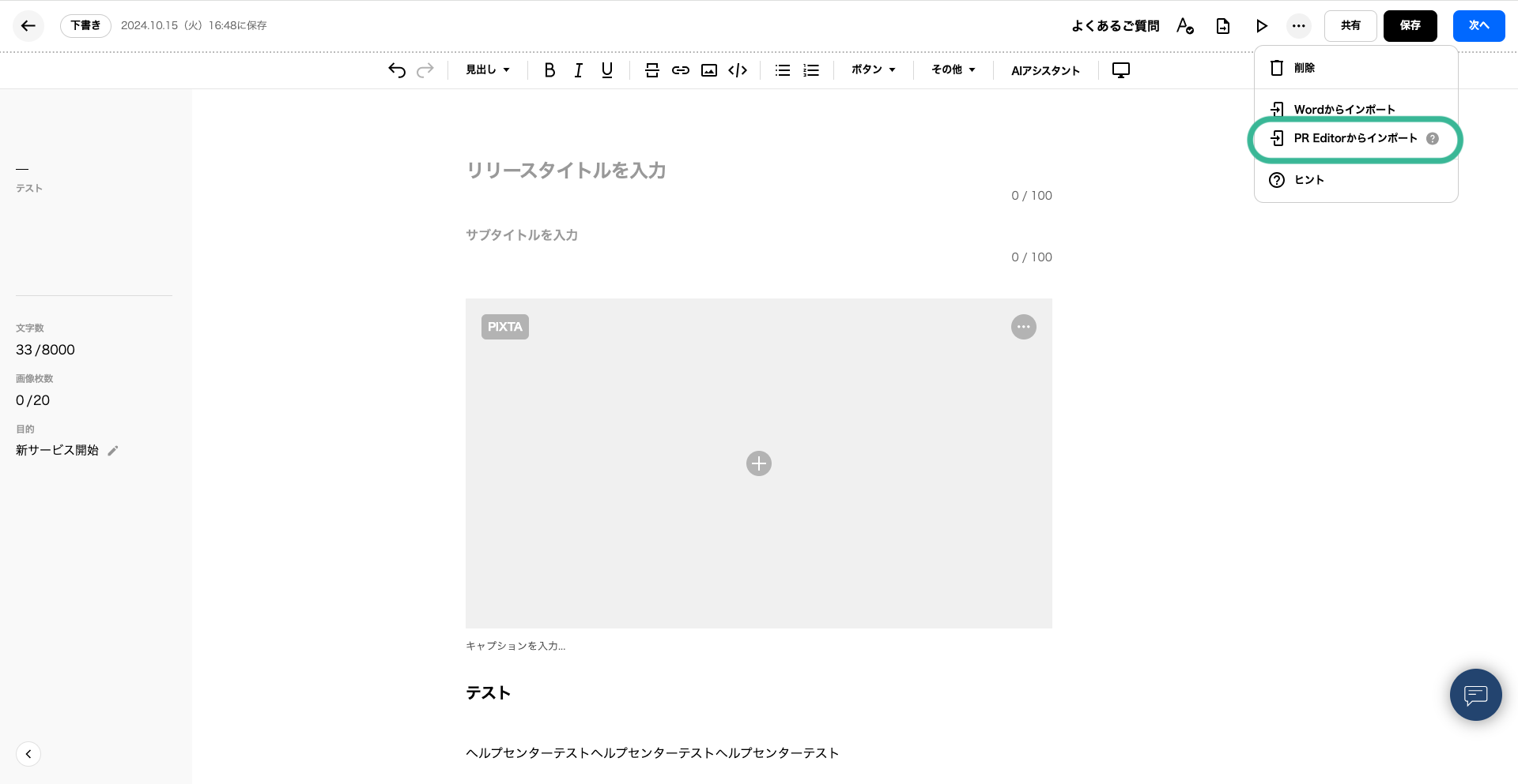<PR TIMES管理画面のプレスリリース新規作成画面にインポートする>