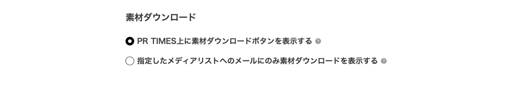 「指定したメディアリストへのメールにのみ素材ダウンロードを表示する」では、PR TIMES上のプレスリリースには素材ダウンロードボタンを表示せず、指定したメディアリストへ送信するメールのみに、ダウンロードリンクを表示する場合に設定します。