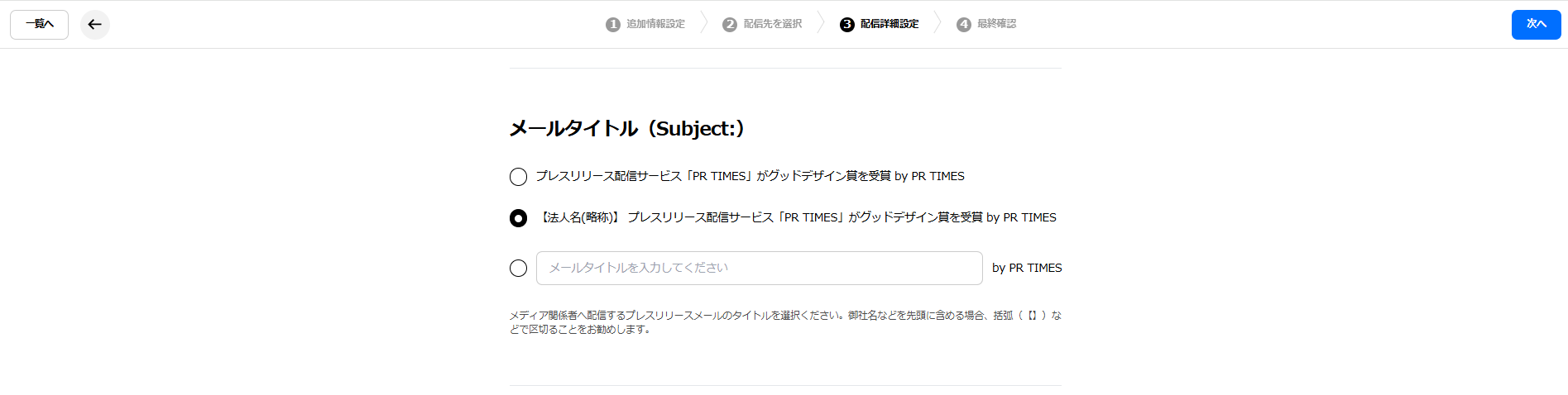 メディア関係者へ配信するプレスリリースメールのタイトルを選択ください。