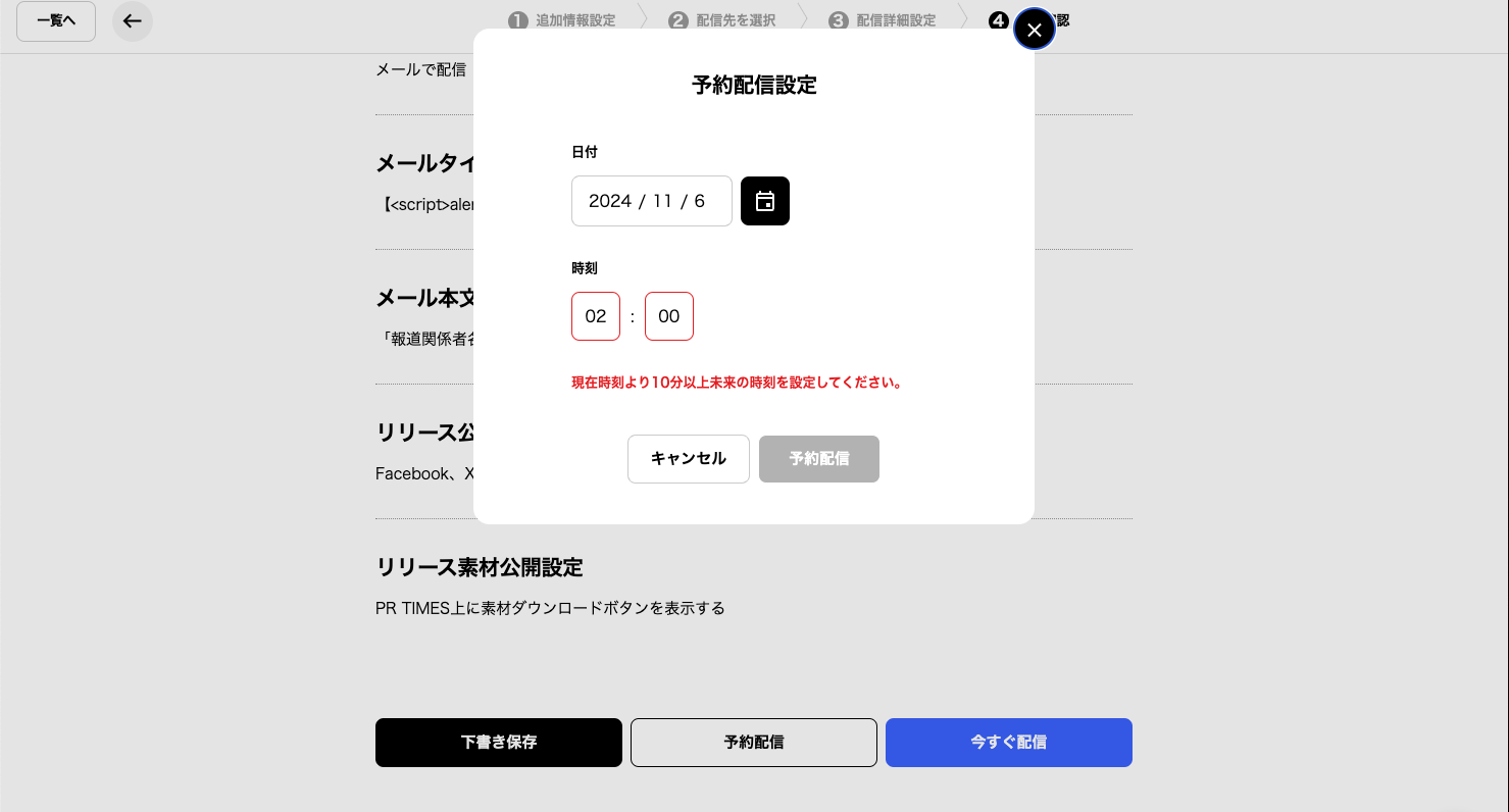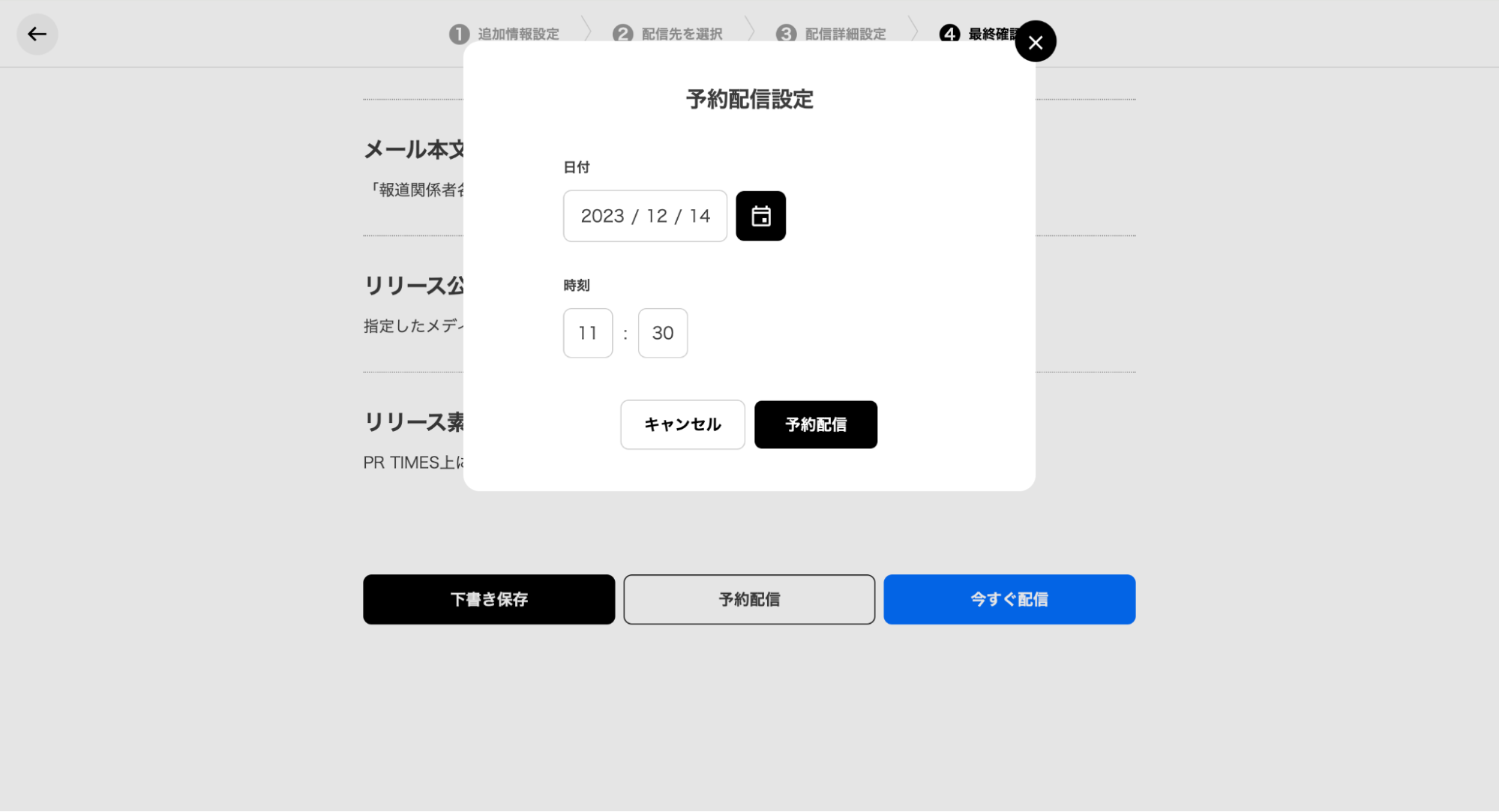 予約配信の場合は、プレスリリース配信日時の設定を行って下さい。