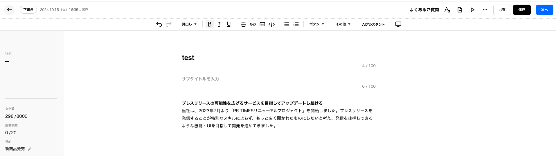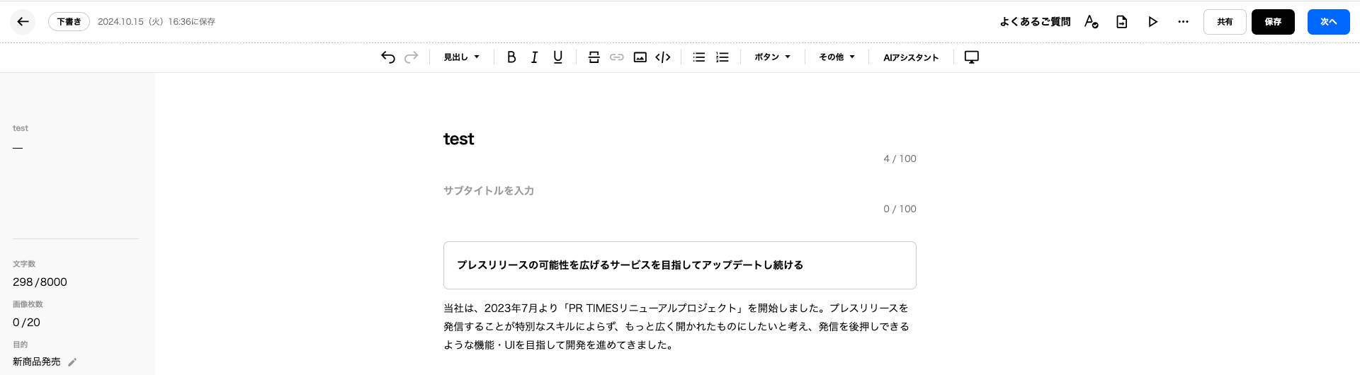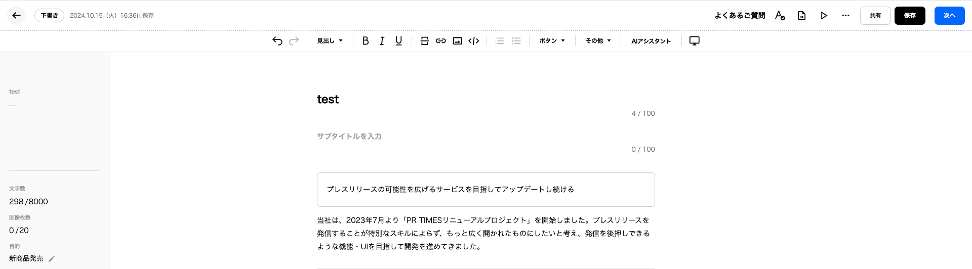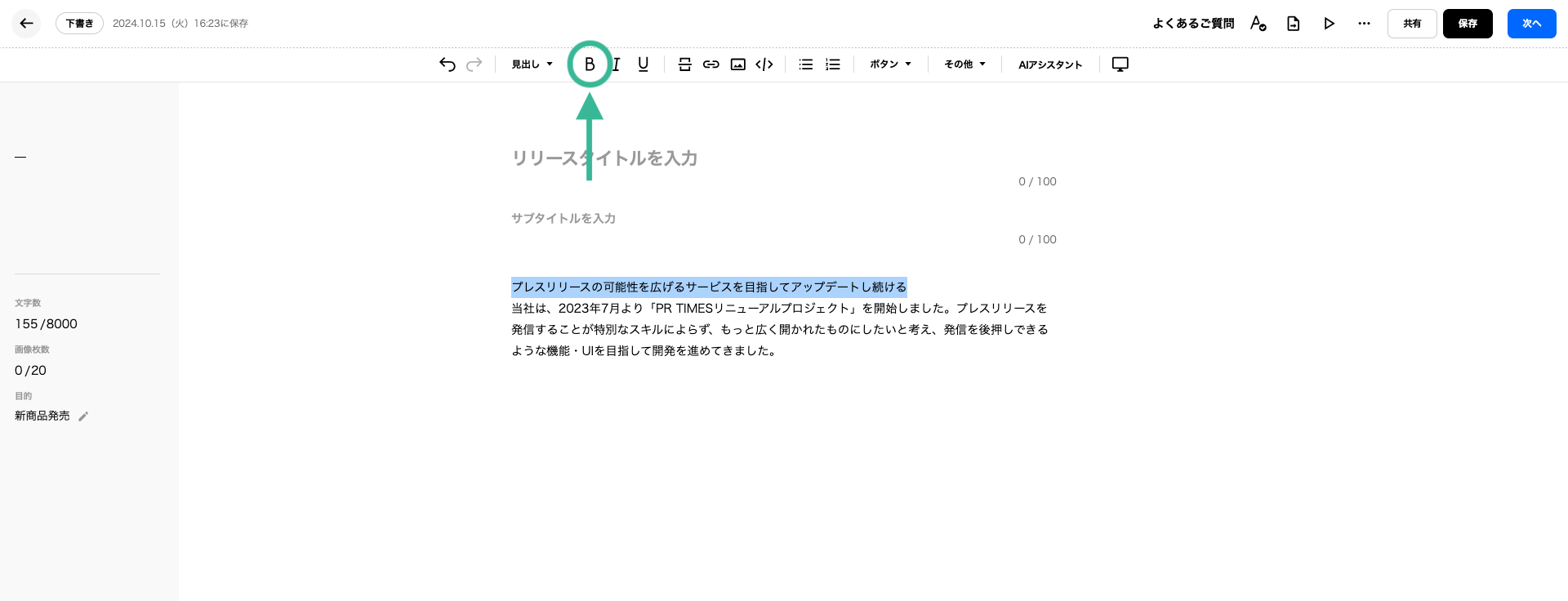 プレスリリース新規作成画面において、「リード文」入力箇所はありません。そのため、下記の機能を利用することでリード文として文章を目立たせることが可能です。ぜひご活用ください。